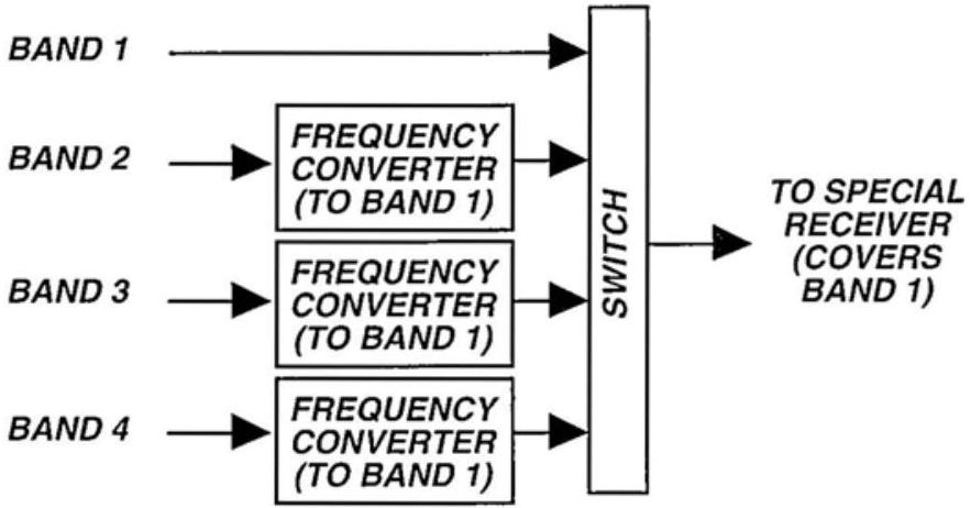 图 4.12 多频段变换器常用于将系统全频率范围的等带宽部分外差到一个频段中,由特殊接收机处理。