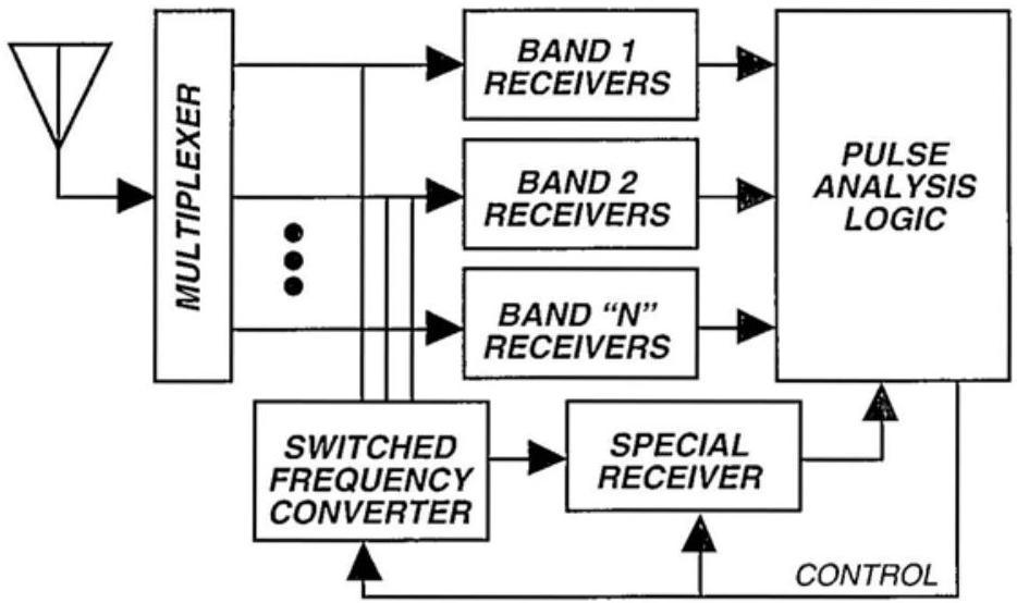 当预期在宽频率范围信号环境中出现一定数量“难以处理”的信号时,解决方法是在配置中选择性地使用特殊接收机,如图 4.11 所示。最典型的例子是现代 RWR,它必须在密集脉冲环境中处理少量 CW 或其他复杂信号。各频段接收机为晶体视频接收机,而特殊接收机可以是超外差、通道化或数字接收机。信号分析逻辑根据普通频段接收机提供的数据、对预期环境的先验知识以及可能如图 4.10 所示的 IFM,来分配特殊接收机。如果没有其他线索,逻辑可能会简单地让特殊接收机按照优先级搜索模式在整个频率范围内循环。