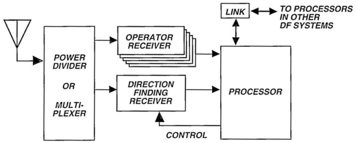 图 4.13 典型的通信频段测向系统在多个台站之间共享单个测向接收机,由多个操作员使用。