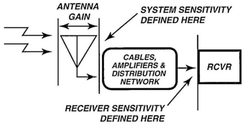 图 4.14 接收机系统灵敏度在接收天线的输出端定义,这样即可通过灵敏度与天线增益之和,确定天线处最小可接受信号。