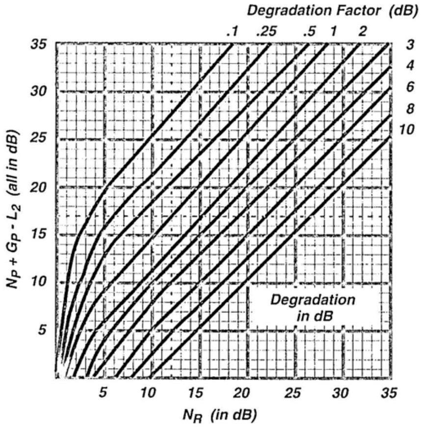 其中 \(L_{1}\) 与 \(N_{P}\) 的数值直接代入,\(D\) 表示前置放大器之后所有部分对系统噪声系数的劣化。\(D\) 的数值可由图 4.17 确定。使用方法是:在横坐标上取接收机噪声系数 \(\left(N_{R}\right)\),纵坐标上取前置放大器增益与噪声系数之和减去前置放大器与接收机之间的损耗 \(\left(N_{P}+G_{P}-L_{2}\right)\),两条直线交点对应的即为劣化值(dB)。图中的例子为:接收机噪声系数为 12 dB,前置放大器增益与噪声系数之和减去接收机前的损耗为 17 dB(例如,15 dB 增益,5 dB 噪声系数,3 dB 损耗)。对应的劣化为 1 dB。如果天线与前置放大器之间的损耗为 2 dB,则最终系统噪声系数为 \(2 \mathrm{~dB}+5 \mathrm{~dB}+1 \mathrm{~dB}=8 \mathrm{~dB}\)。