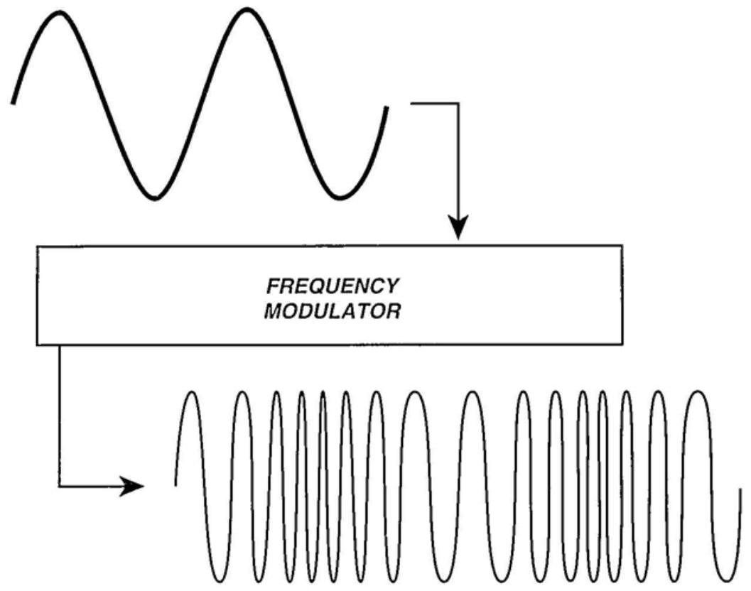 图 4.18 调频通过传输频率的变化来携带调制信号的幅度。