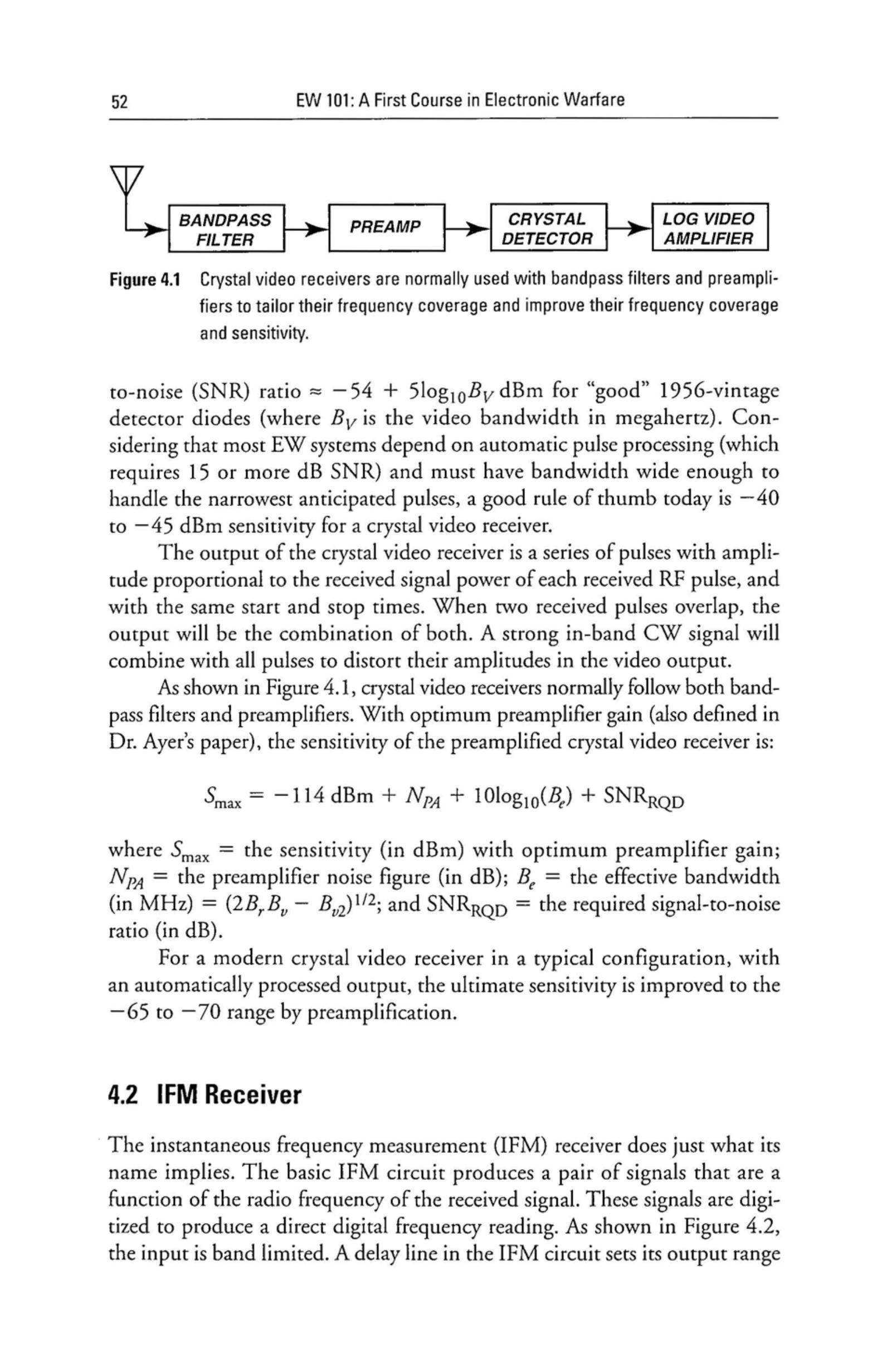 如图 4.1 所示,晶体视频接收机通常接在带通滤波器和前置放大器之后。在最佳前置放大器增益条件下(也在 Ayer 博士的论文中定义),带前置放大器的晶体视频接收机的灵敏度为:
