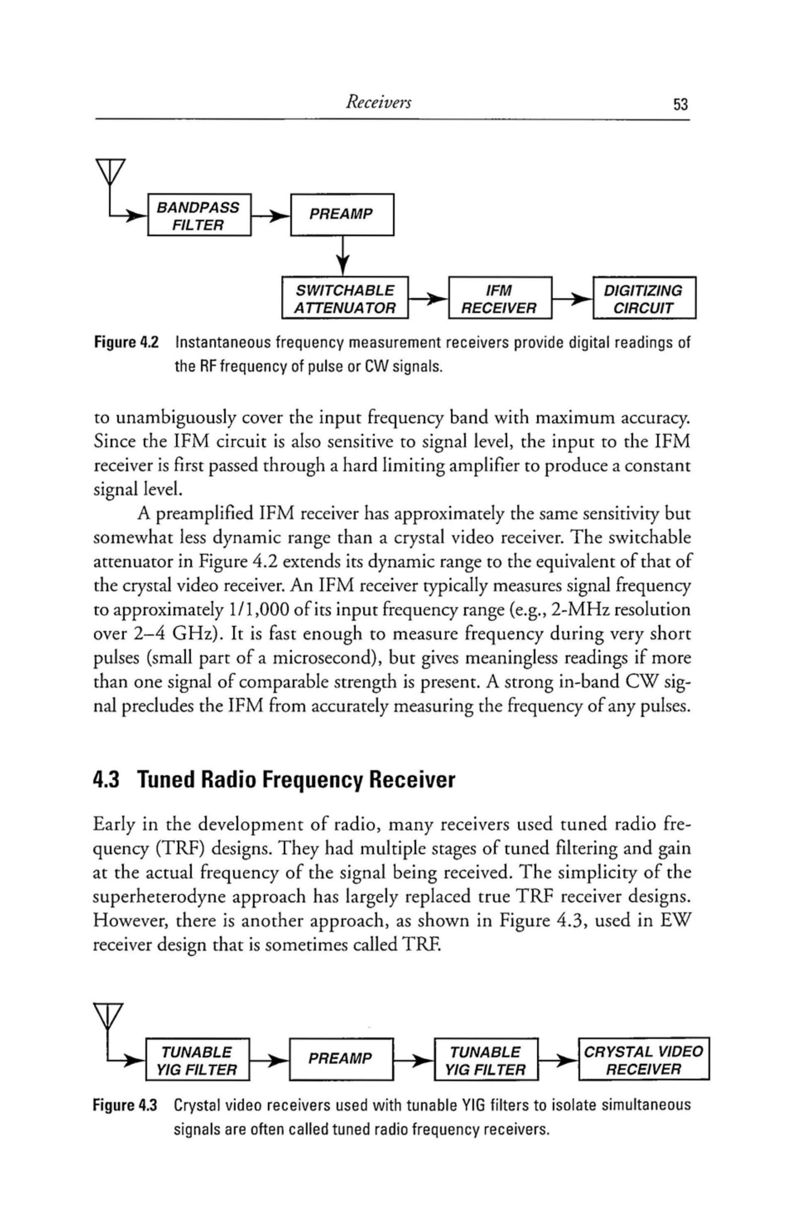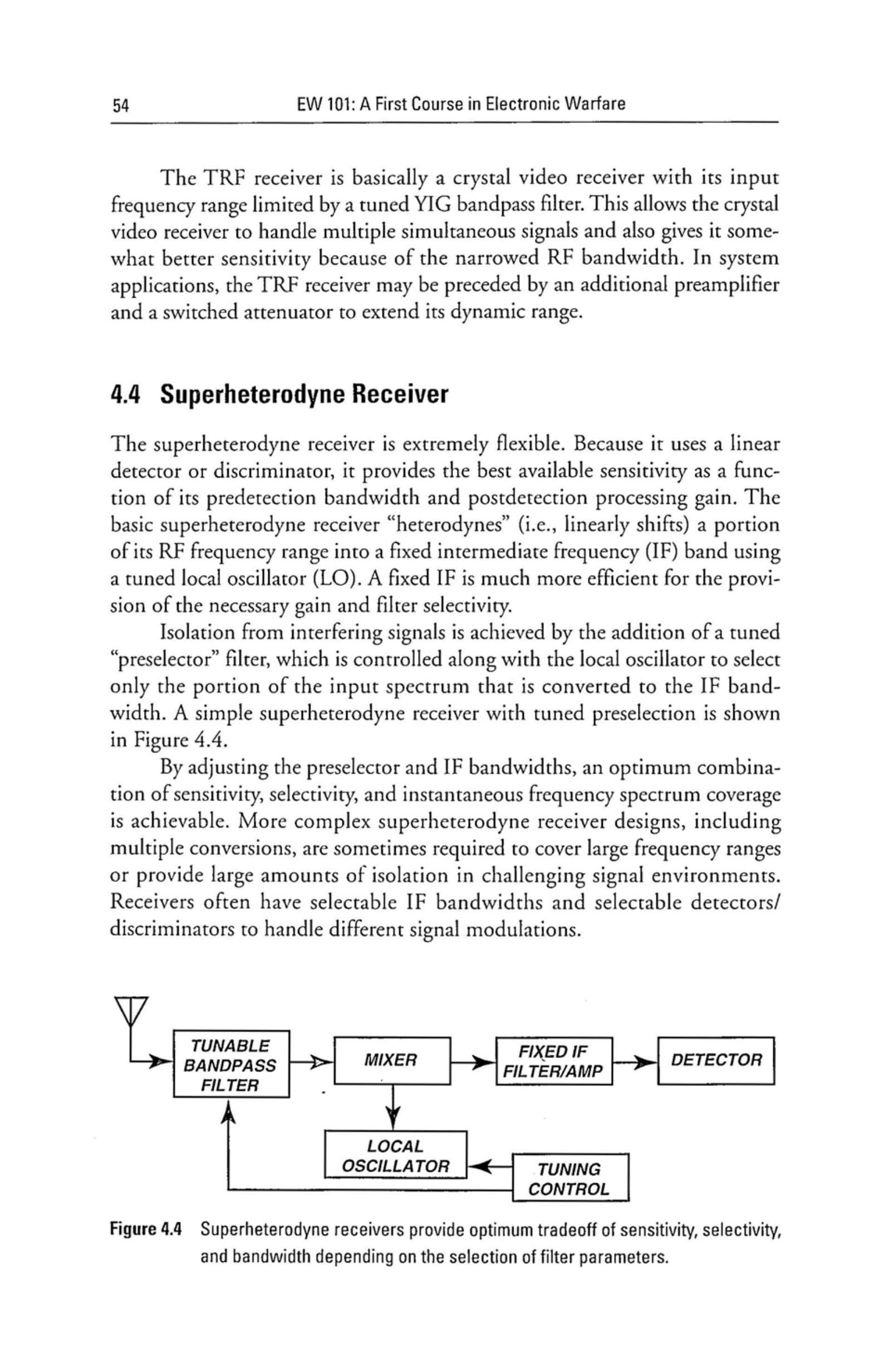 在无线电发展早期,许多接收机采用调谐射频(TRF)设计。它们在接收信号的实际频率上具有多级调谐滤波与增益。由于超外差方法的简单性,真正的 TRF 接收机设计已基本被取代。然而,如图 4.3 所示,在电子战接收机设计中仍然存在一种被称为 TRF 的方式。