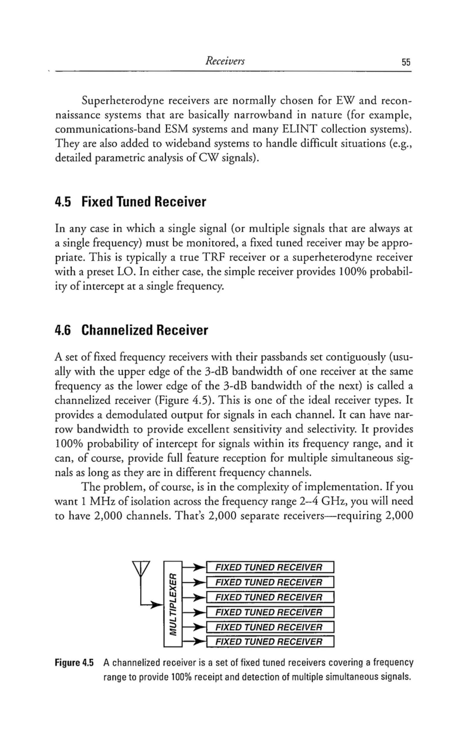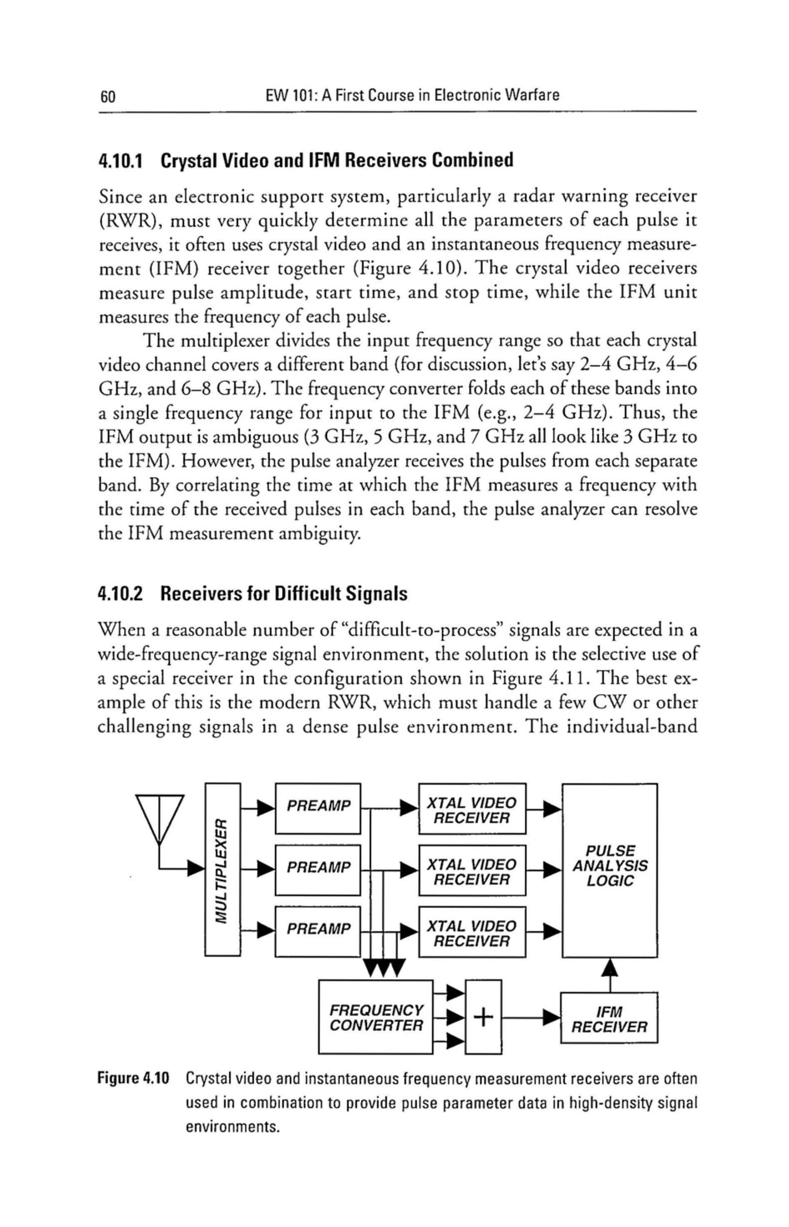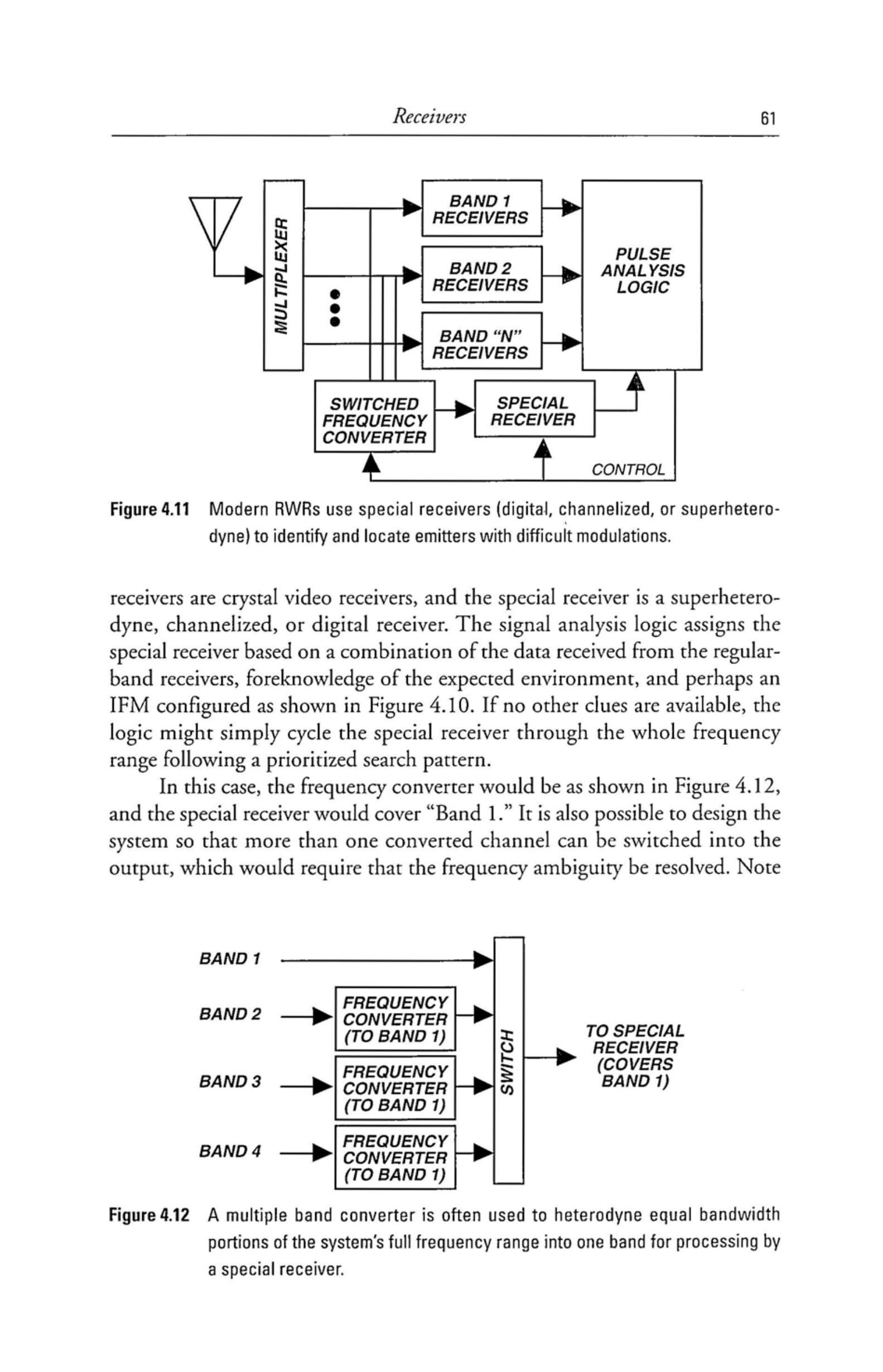 总体而言,晶体视频和瞬时频率测量(IFM)接收机用于在高密度脉冲信号环境下运行的低到中成本系统。它们都能提供宽频率范围的 \(100 \%\) 覆盖,但无法优雅地处理多个同时出现的信号。因此,在其频率范围内的任何高功率连续波信号都会严重降低其接收脉冲的能力。此外,它们灵敏度较低,因此最适合应对强信号。在现代系统中,它们通常与窄带接收机组合,以应对问题场景。