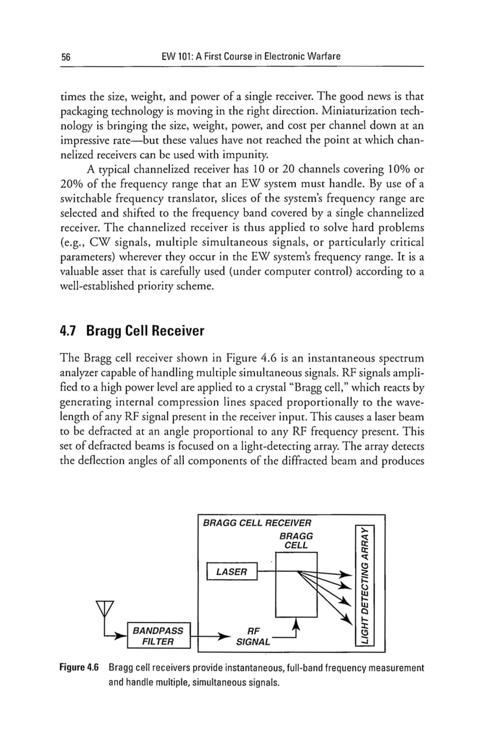 如图 4.6 所示,布拉格池接收机是一种能够处理多个同时信号的瞬时频谱分析仪。经放大的 RF 信号被加到晶体“布拉格池”上,晶体通过产生内部压缩条纹响应输入信号,这些条纹间距与接收输入 RF 信号的波长成比例。这使得激光束以与输入 RF 频率成比例的角度衍射。衍射光束集束到光探测阵列上。该阵列检测衍射光束各分量的偏转角度,并产生输出信号,由此可得出输入中存在的所有信号频率的数字读数。