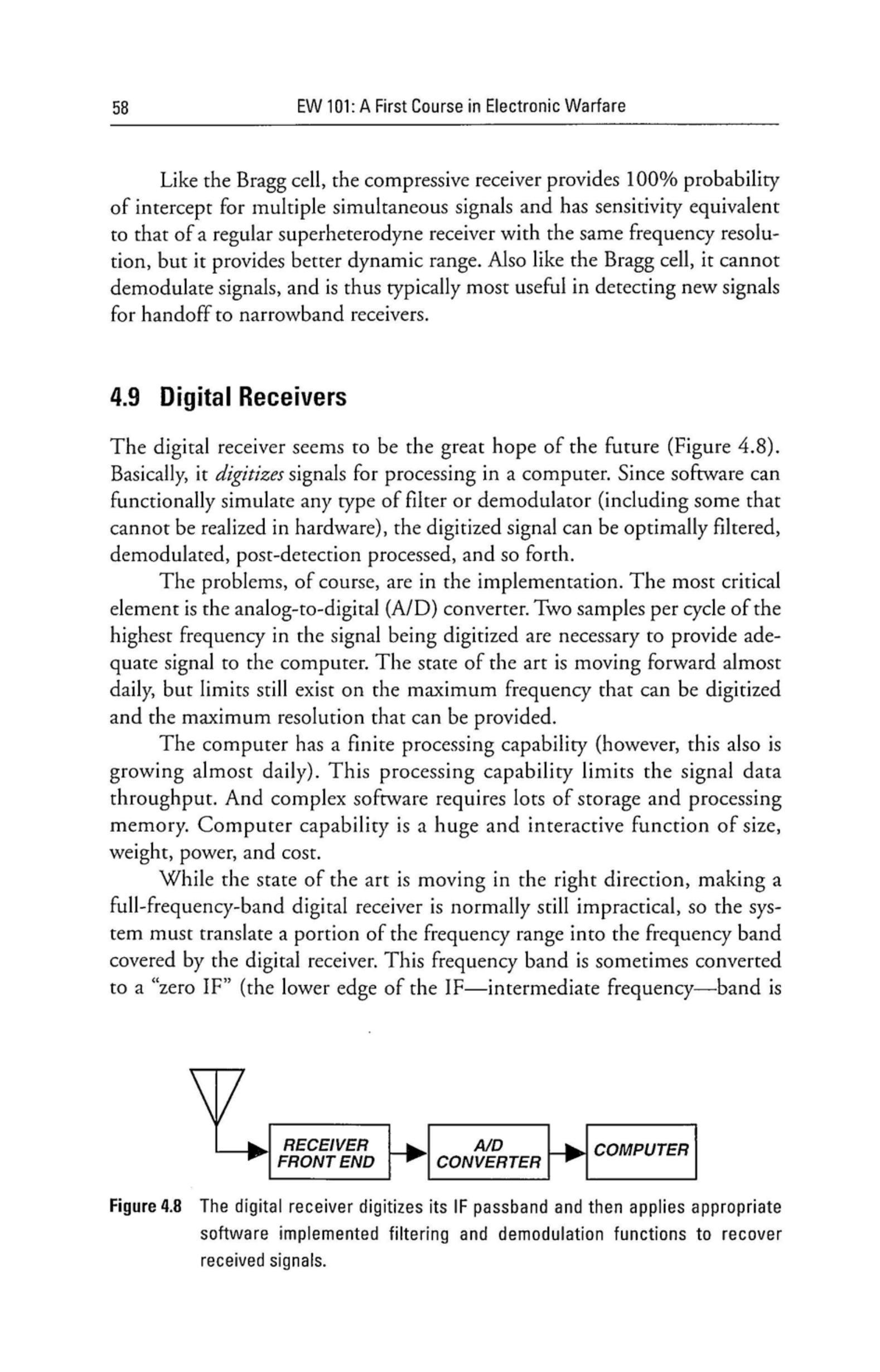 数字接收机似乎是未来的希望(见图 4.8)。它基本上通过数字化信号并在计算机中处理。由于软件可以功能性地模拟任何类型的滤波器或解调器(包括一些无法用硬件实现的),因此数字化信号可以被最优地滤波、解调、后检波处理等。