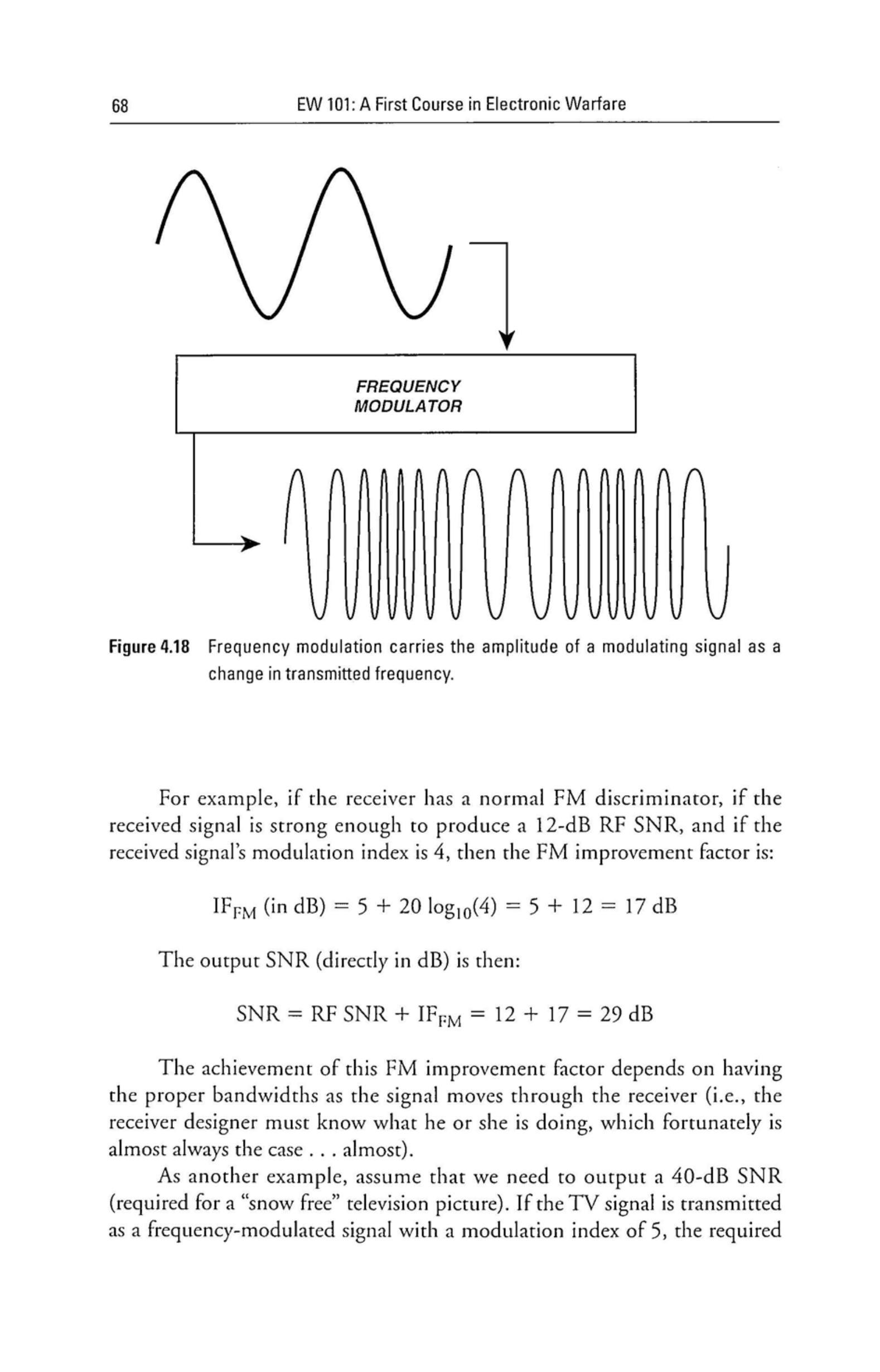 例如,对于一个普通 FM 鉴频器,若接收信号足够强以产生 \(12-\mathrm{dB}\) RF SNR,且接收信号的调制度为 4,则 FM 改善因子为: