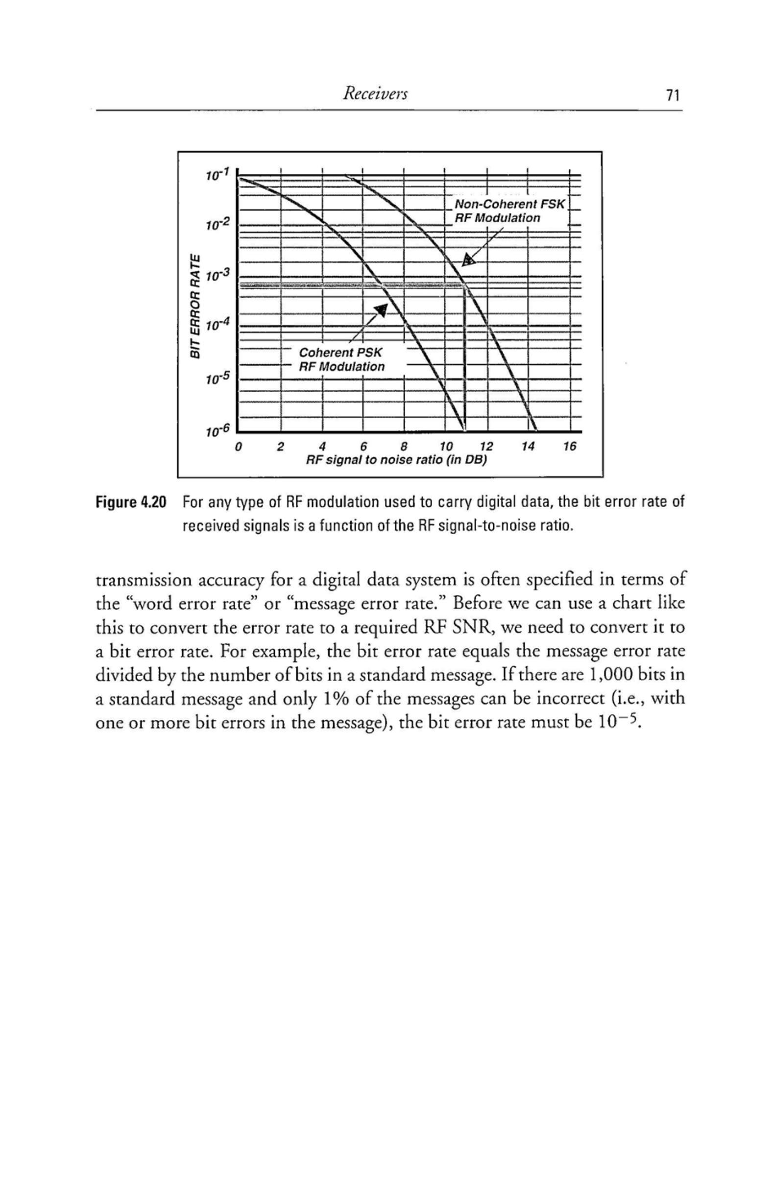 比特错误率与 RF SNR 的关系因调制方式而异,但通常介于相干移相键控(PSK)与非相干频移键控(FSK)的性能曲线之间,如图 4.20 所示。比特错误率定义为错误比特数与传输比特总数之比。在图示例子中,采用非相干 FSK 调制的数字信号在接收机端以 \(11-\mathrm{dB}\) RF SNR 到达时,其比特错误率略低于 \(10^{-3}\)。若采用相干 PSK 调制,则比特错误率约为 \(10^{-6}\)。请注意,数字数据系统的传输精度通常以“字错误率”或“消息错误率”表示。在使用此类图表将错误率转换为所需 RF SNR 之前,必须先将其转换为比特错误率。例如,若一个标准消息包含 1000 比特,且最多允许 \(1 \%\) 消息错误(即消息中存在一个或多个比特错误),则所需的比特错误率为 \(10^{-5}\)。