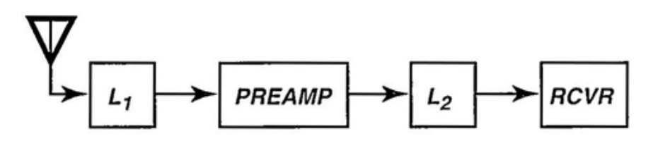 再考虑带有前置放大器的接收机系统,如图 4.16 所示。变量定义如下:\(L_{1}\)(天线与前置放大器之间的损耗,dB)、\(G_{P}\)(前置放大器增益,dB)、\(N_{P}\)(前置放大器噪声系数,dB)、\(L_{2}\)(前置放大器与接收机之间的损耗,dB)、\(N_{R}\)(接收机噪声系数,dB)。该系统的噪声系数(NF)由下式确定: