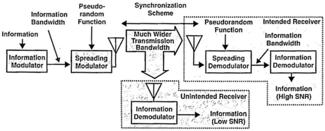 在军事应用中,扩频码被严格保密,就像加密中使用的伪随机码一样。因此,敌方试图截获DS信号时,无法对信号解扩,必须面对极低功率密度的扩频传输。