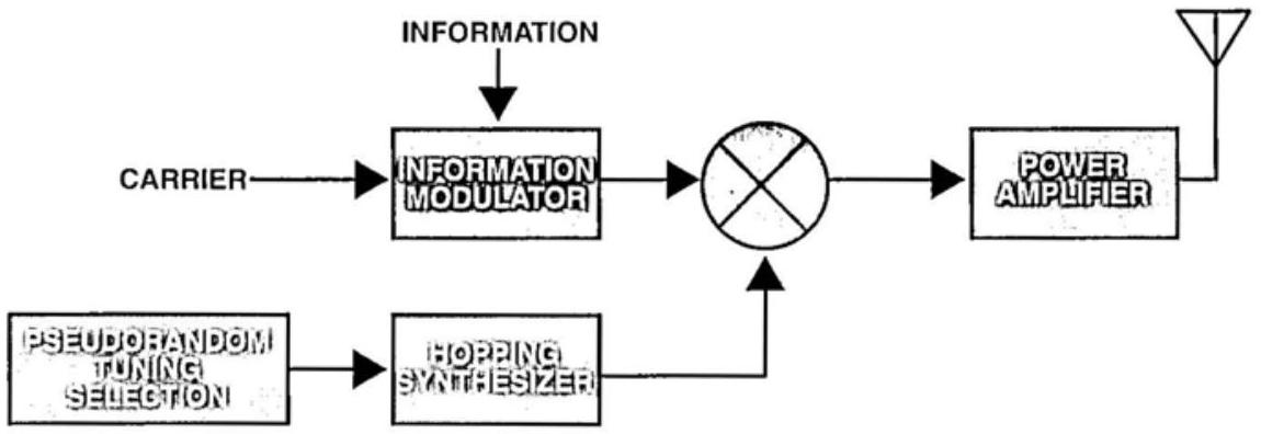 图7.3 跳频信号由调制信号与伪随机调谐频率选择电路控制的本地振荡器进行外差变频生成。
