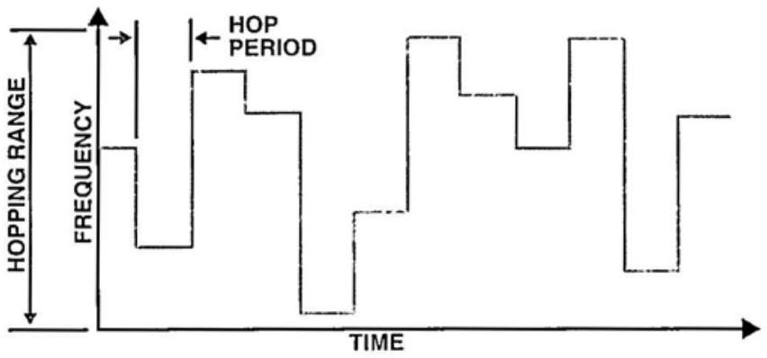 跳频信号属于低截获概率(LPI)信号,因为其在某一频率上停留的时间太短,操作员无法探测到信号的存在。以上述例子为例,信号在任意频率上出现的概率仅为 \(0.04\%\),因此其接收功率(随时间平均)显著降低,即使其在单个频率上于跳变周期内具有全功率。
