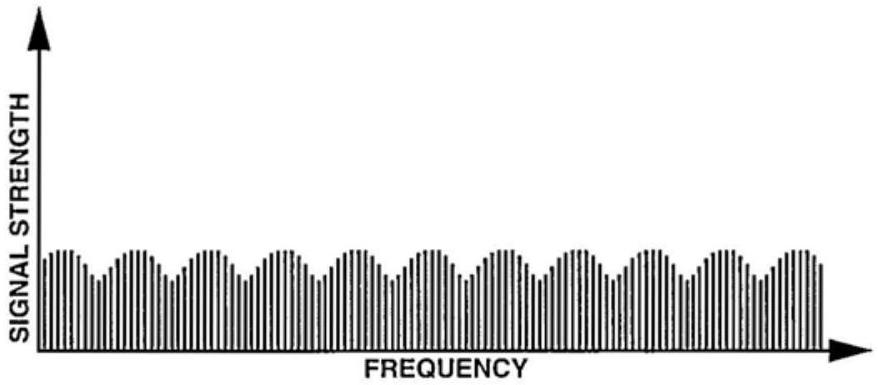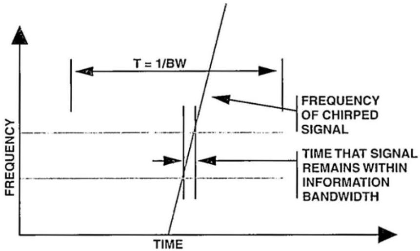 例如,假设信息带宽为10 kHz,信号以1毫秒每次的线性扫频速率横跨10 MHz。在其10 MHz扫频范围的任意10 kHz段内,信号仅停留 \(1 \mu \mathrm{sec}\),仅为充分接收信号所需时间的 \(1\%\)。