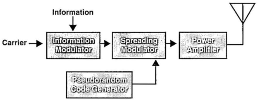 图7.11 直接序列扩频发射机将信息信号与比其信息带宽所需速率高得多的伪随机数字信号进行调制。