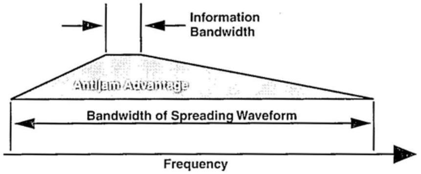 图7.5 若要用传统干扰机持续压制跳频信号,干扰机功率必须分布在整个跳变范围内。跳变范围与信息带宽之比即为抗干扰优势。