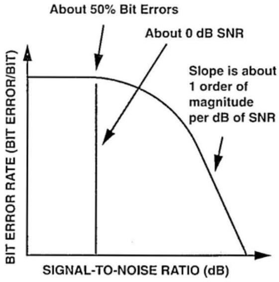 如图7.17所示,数字接收机输出中的比特错误率与输入接收机的带内信噪比(SNR)之间存在非线性关系。通信理论教材包含各种曲线族,每种数字调制技术都有对应曲线。但所有曲线的基本形状如该典型例子所示。曲线在约 \(50\%\) 比特错误率处趋于平坦。这是合乎逻辑的:\(50\%\) 的错误率已是数字信号最坏情况。若比特错误率高于 \(50\%\),输出反而与传输消息更加相关。所有曲线在信噪比约为 \(0 \,\mathrm{dB}\)(即信号=噪声)时达到 \(50\%\) 点。这意味着无论使用何种调制,当噪声水平(或干扰水平)等于接收信号水平时,增加干扰水平不会增加比特错误率。
