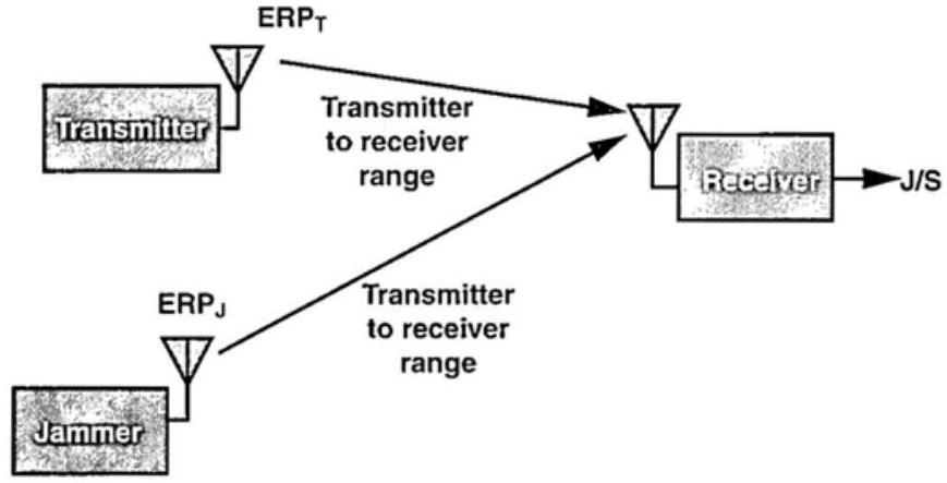 其中,\(\mathrm{J} / \mathrm{S}\) 为干扰/信号比(dB);\(\mathrm{ERP}_{J}\) 为干扰机ERP(dBm);\(\mathrm{ERP}_{T}\) 为发射机ERP(dBm);\(d_{J}\) 为干扰机至接收机的距离(任意单位);\(d_{T}\) 为发射机至接收机的距离(与\(d_J\)同单位)。