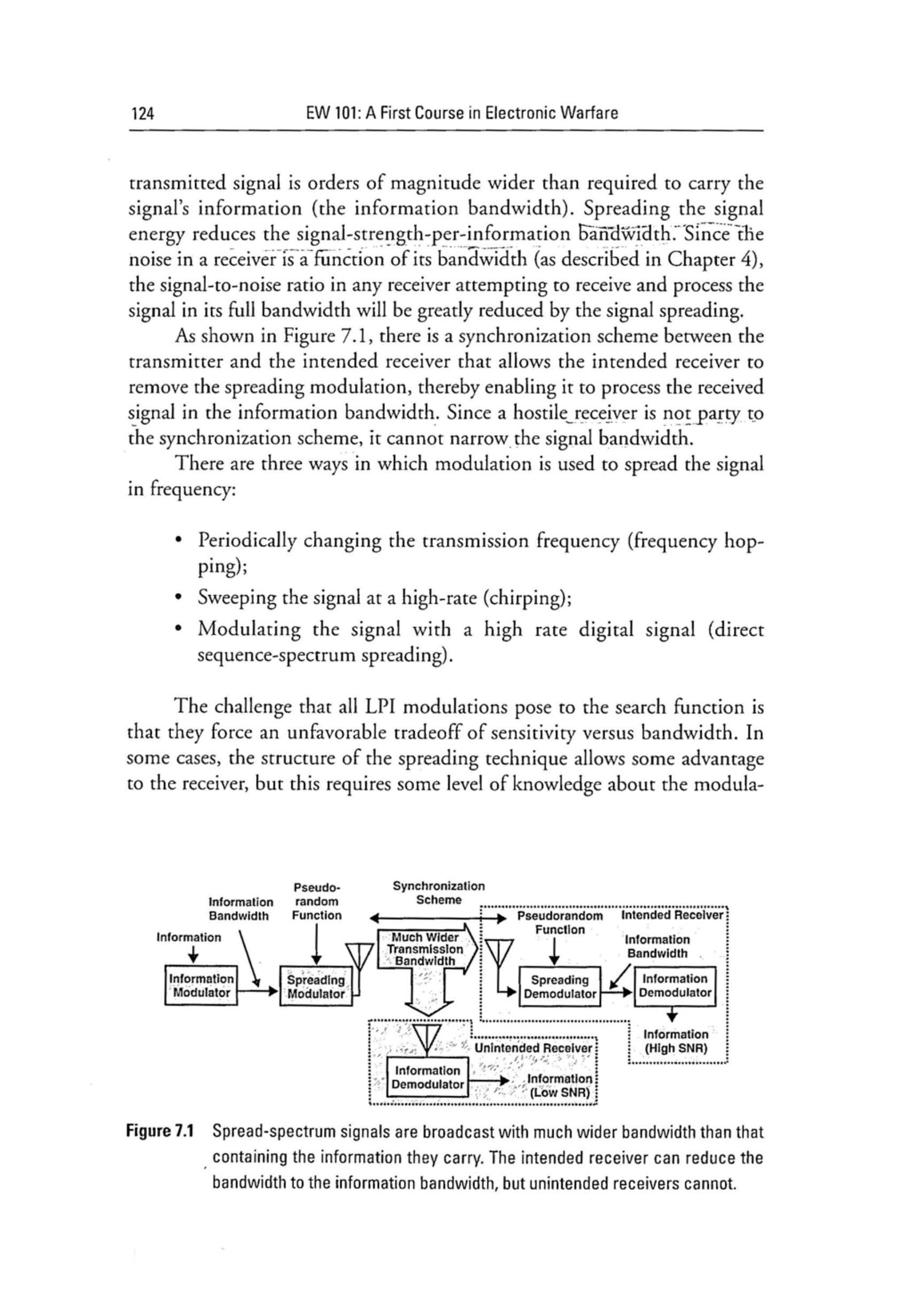 然而,当我们谈到LPI信号时,最常想到的是调制方式,它能降低信号的可探测性。LPI调制将信号能量在频率上展宽,使发射信号的频谱远大于承载信息所需的带宽(信息带宽)。展宽信号能量降低了单位信息带宽的信号强度。由于接收机噪声取决于带宽(第4章已述),任何试图在全带宽下接收和处理信号的接收机,其信噪比都会因信号展宽而大幅下降。
