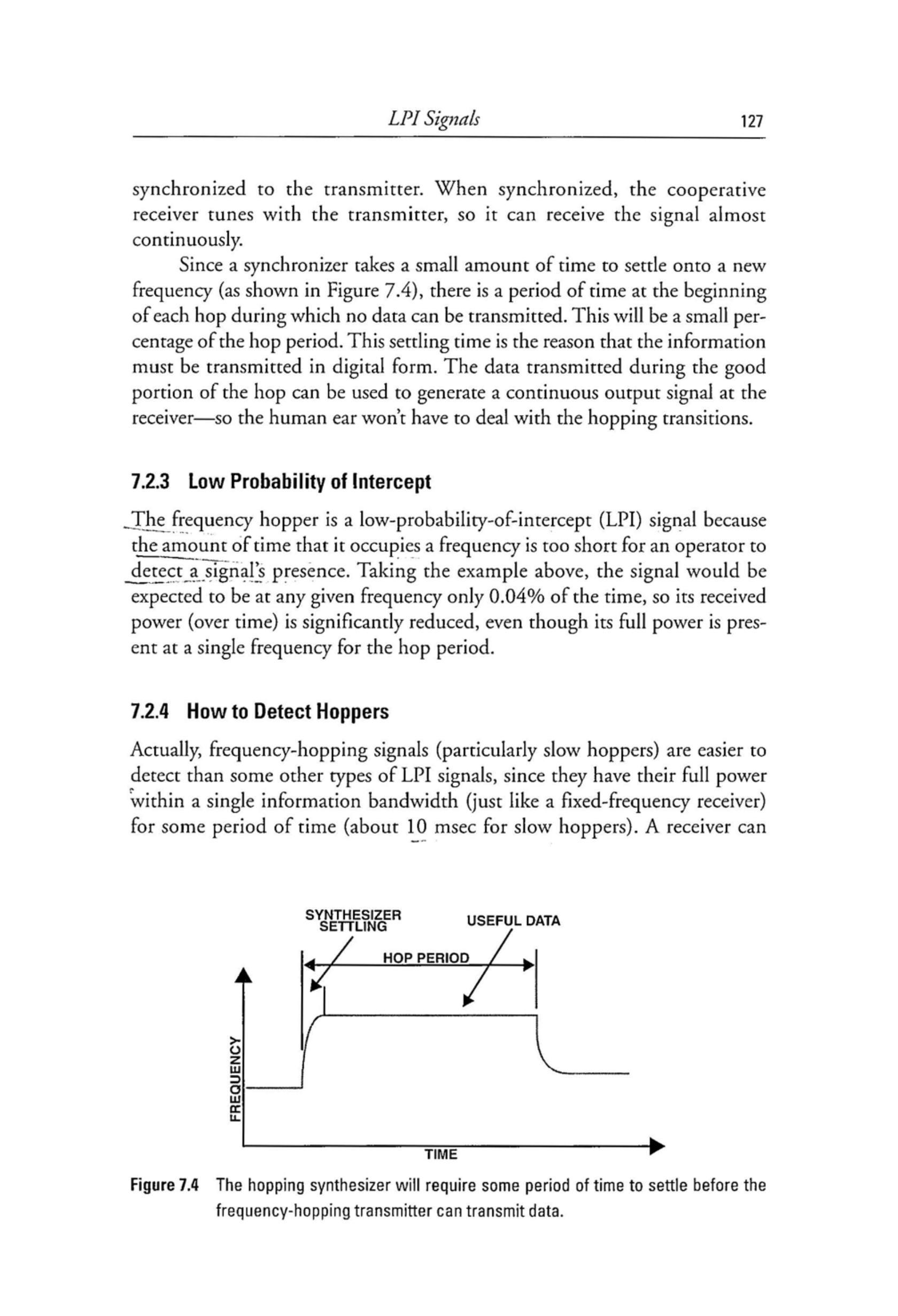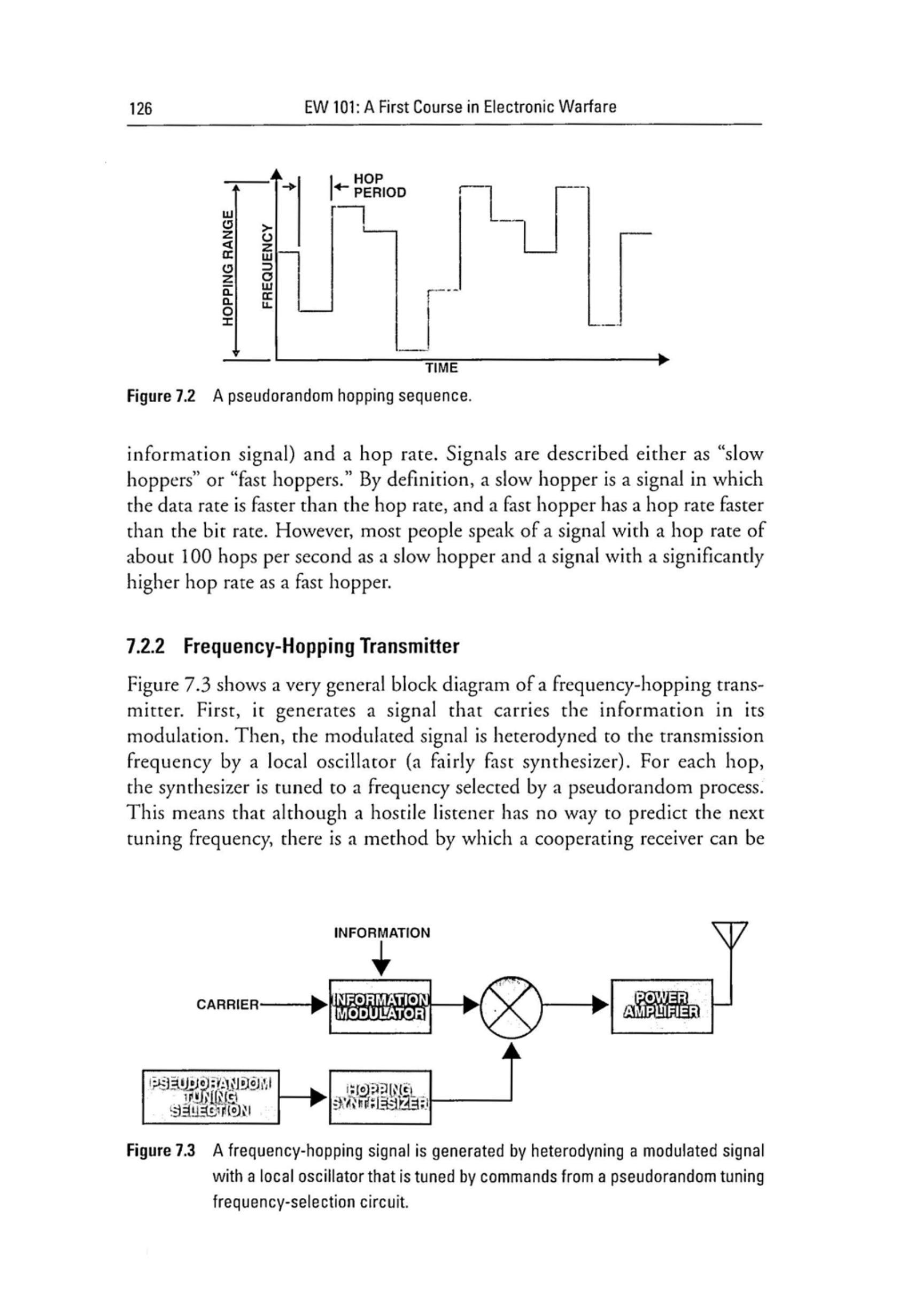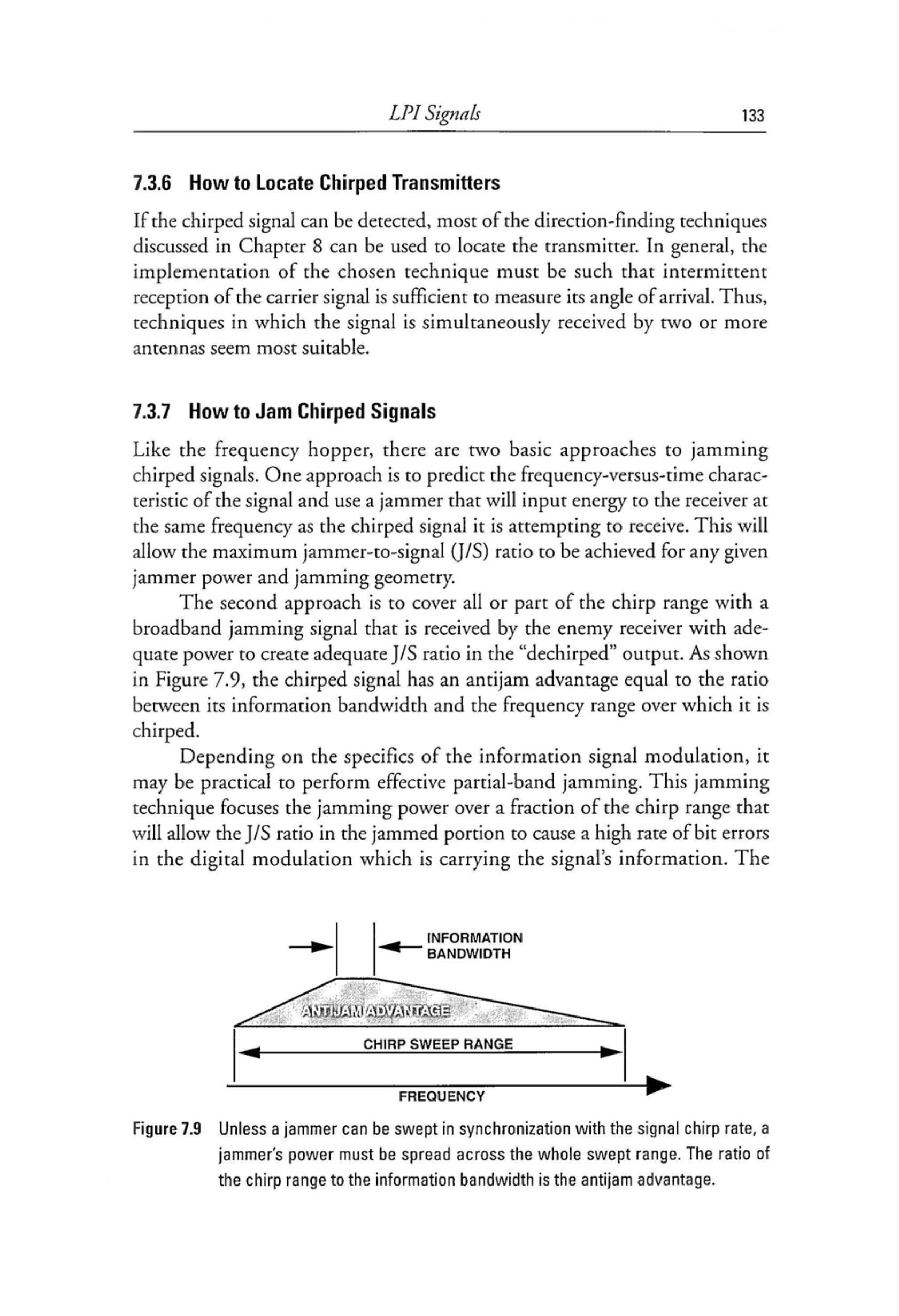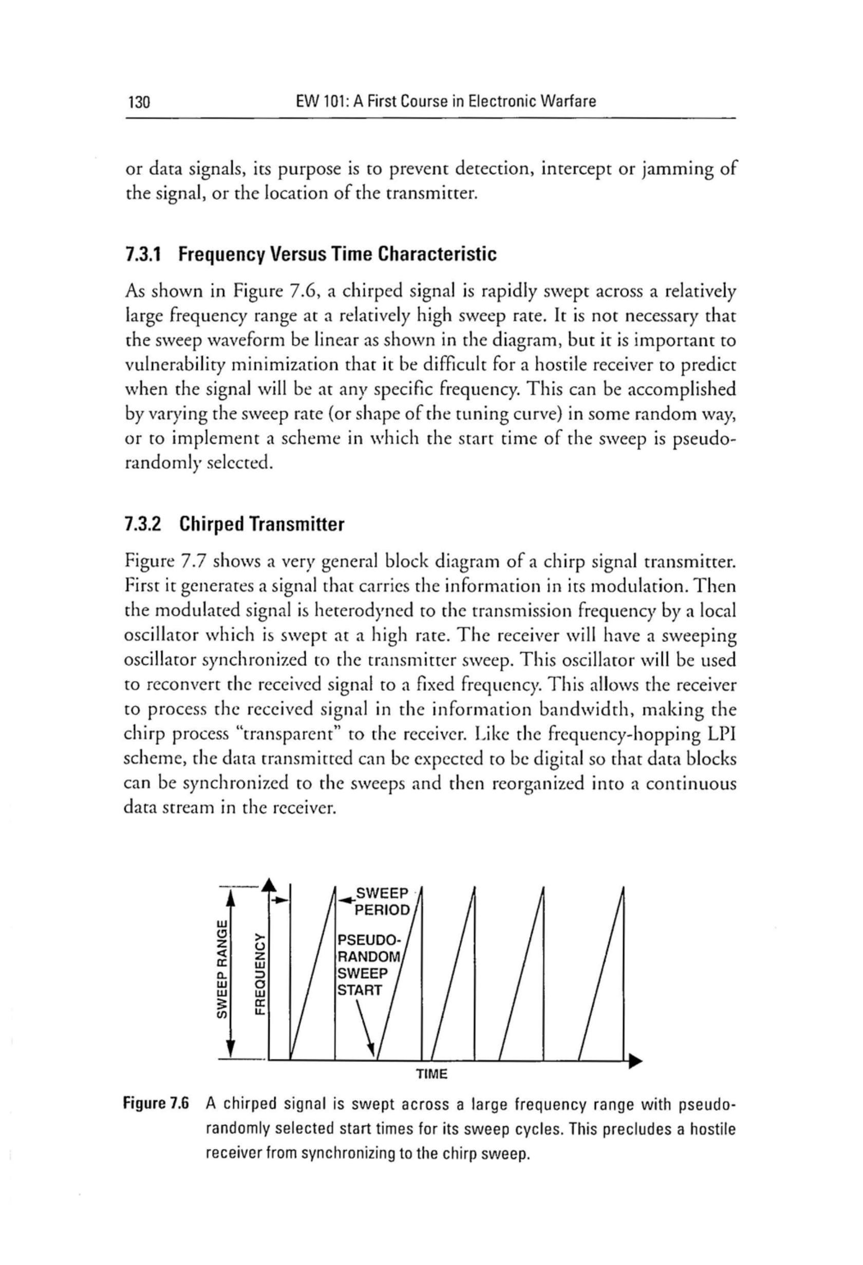 如图7.6所示,扫频信号以较高的扫频速率横跨一个相对较大的频率范围。扫频波形不必是线性的(如图所示),但为了最小化脆弱性,必须使敌方接收机难以预测信号在某一频率出现的时刻。这可以通过以随机方式改变扫频速率(或调谐曲线形状),或采用伪随机选择扫频起始时间的方式来实现。