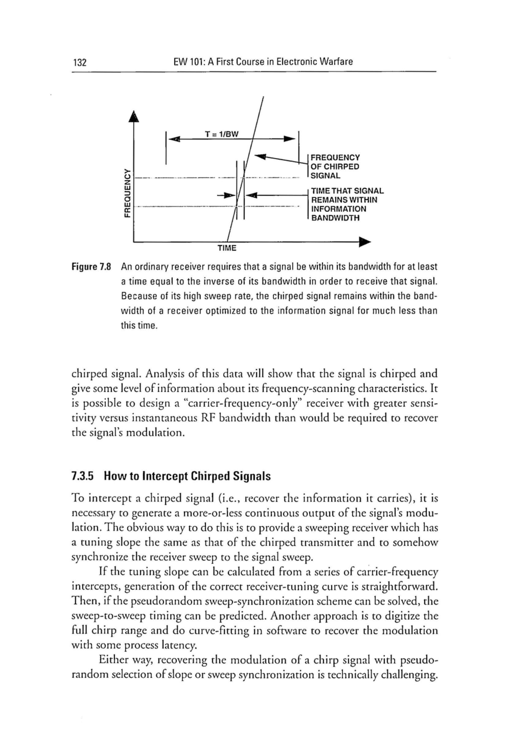 如第6章所述,信号必须在接收机带宽内停留时间大于带宽的倒数,接收机才能以全灵敏度探测该信号。(例如,\(10 \,\mathrm{kHz}\) 带宽要求信号存在时间不少于 \(1/10,000 \,\mathrm{Hz}\),即 \(100 \mu \mathrm{sec}\)。)如图7.8所示,扫频信号在信息带宽接收机带宽内的存在时间仅为所需时间的一小部分。