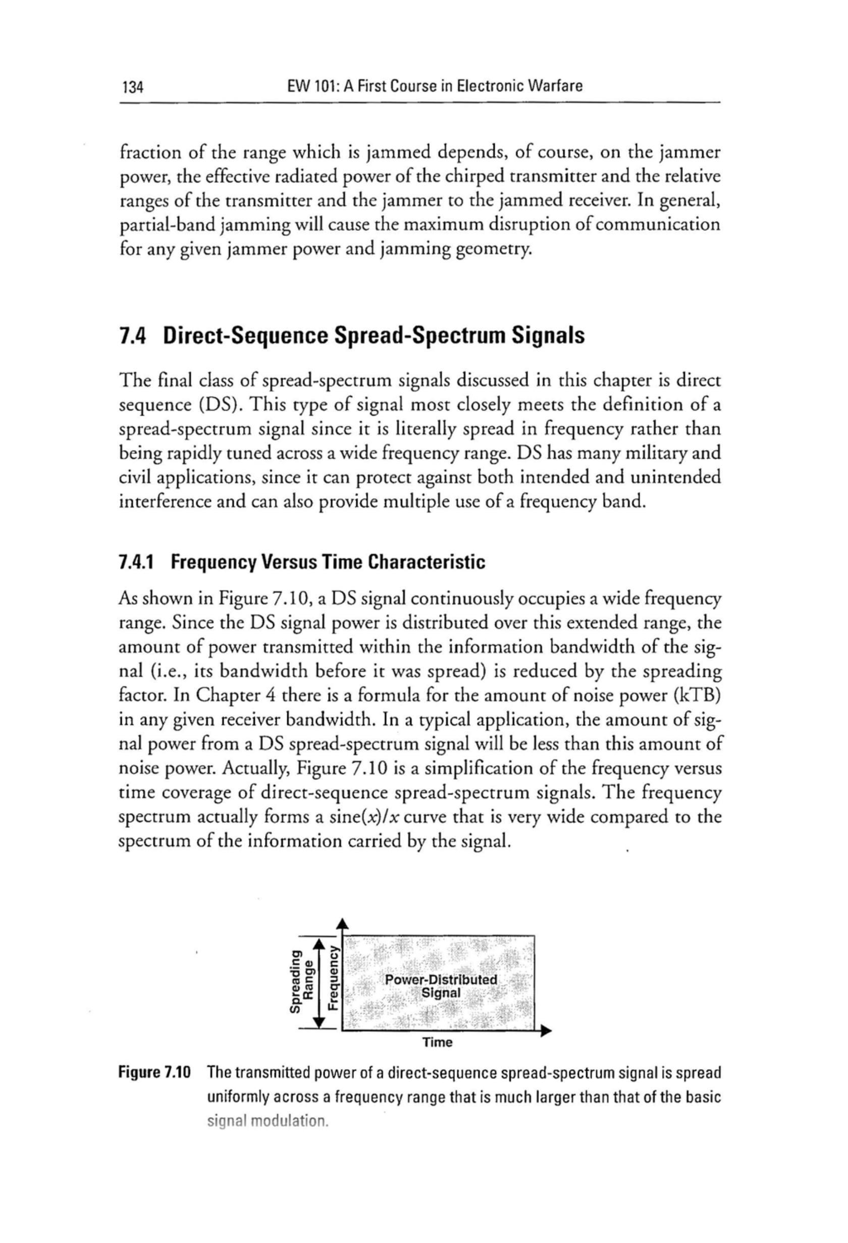 本章讨论的最后一类扩频信号是直接序列(DS, Direct-Sequence)。这种信号最符合扩频信号的定义,因为它确实在频率上被展开,而不是快速调谐到宽频率范围。DS在军事和民用中都有广泛应用,它既能防御有意和无意的干扰,还能实现频段的多用户共享。