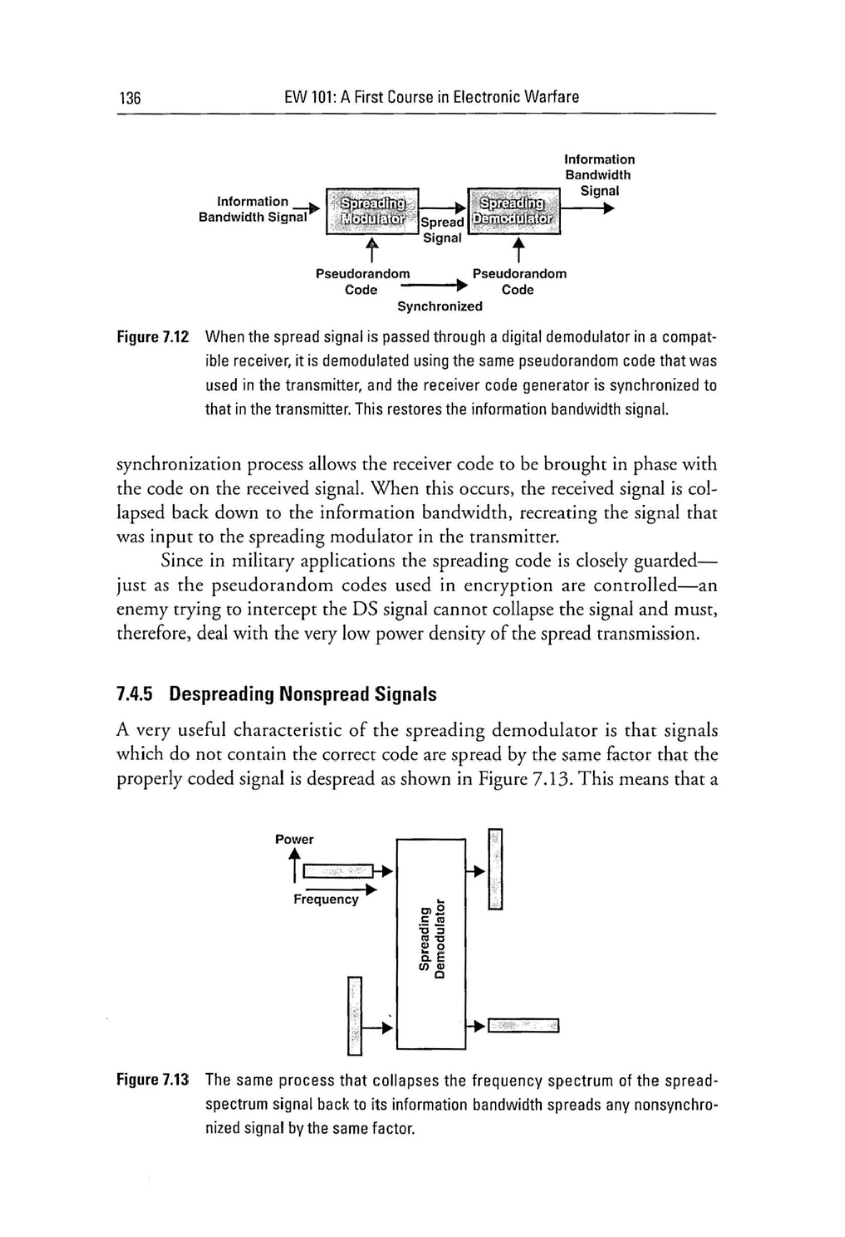 如图7.1所示,发射机与目标接收机之间存在同步机制,目标接收机可去除展频调制,从而在信息带宽内处理接收信号。而敌方接收机并不具备该同步机制,因此无法缩窄信号带宽。