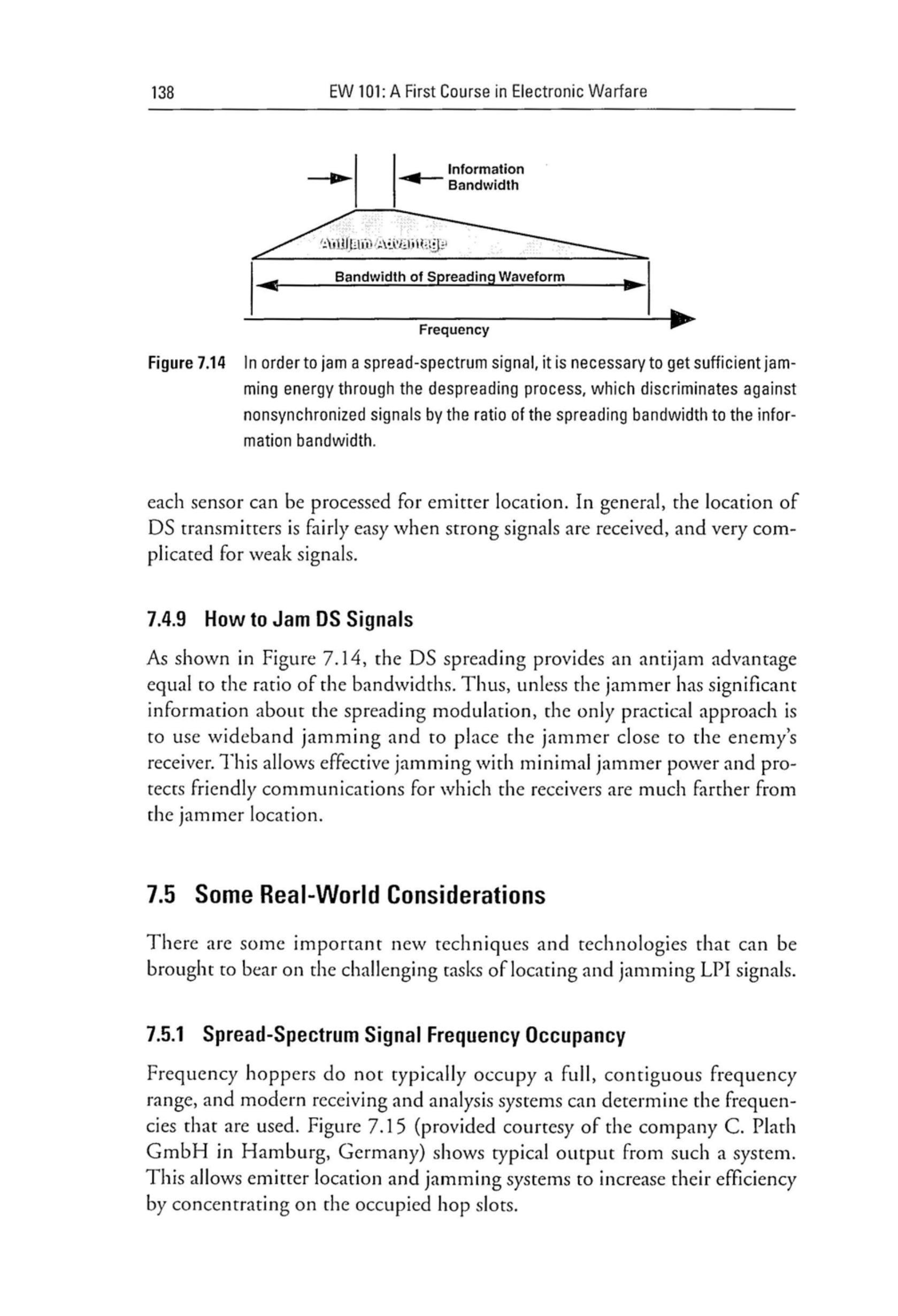 如图7.14所示,DS扩频提供了等于带宽比的抗干扰优势。因此,除非干扰机掌握足够的扩频调制信息,否则唯一可行的方法是使用宽带干扰,并将干扰机部署在敌方接收机附近。这样能以最小的干扰功率实现有效干扰,同时保护距离干扰机较远的友方通信。