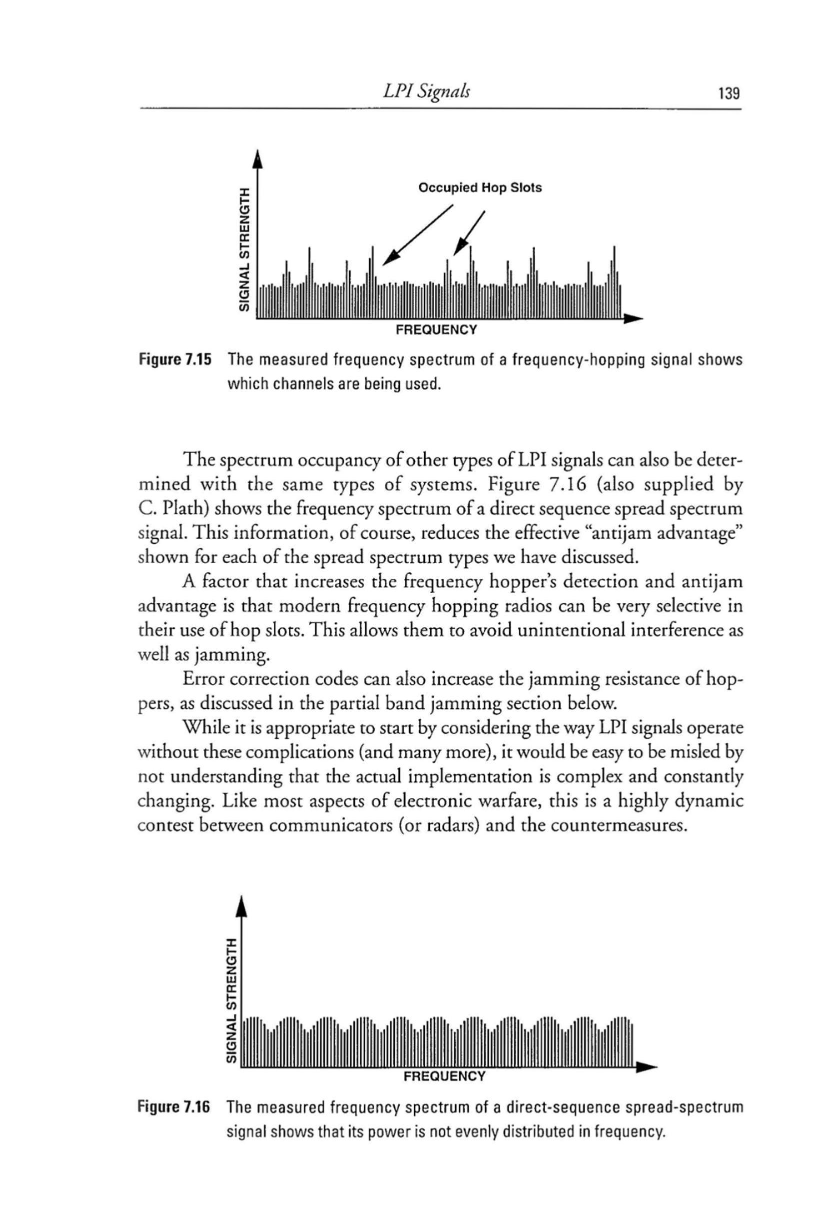 跳频信号通常不会占据完整的连续频率范围,现代接收与分析系统能够确定其所用频率。如图7.15所示(由德国汉堡的C. Plath GmbH提供),这是此类系统的典型输出。这使辐射源定位和干扰系统能集中在实际占用的跳频槽上,从而提高效率。