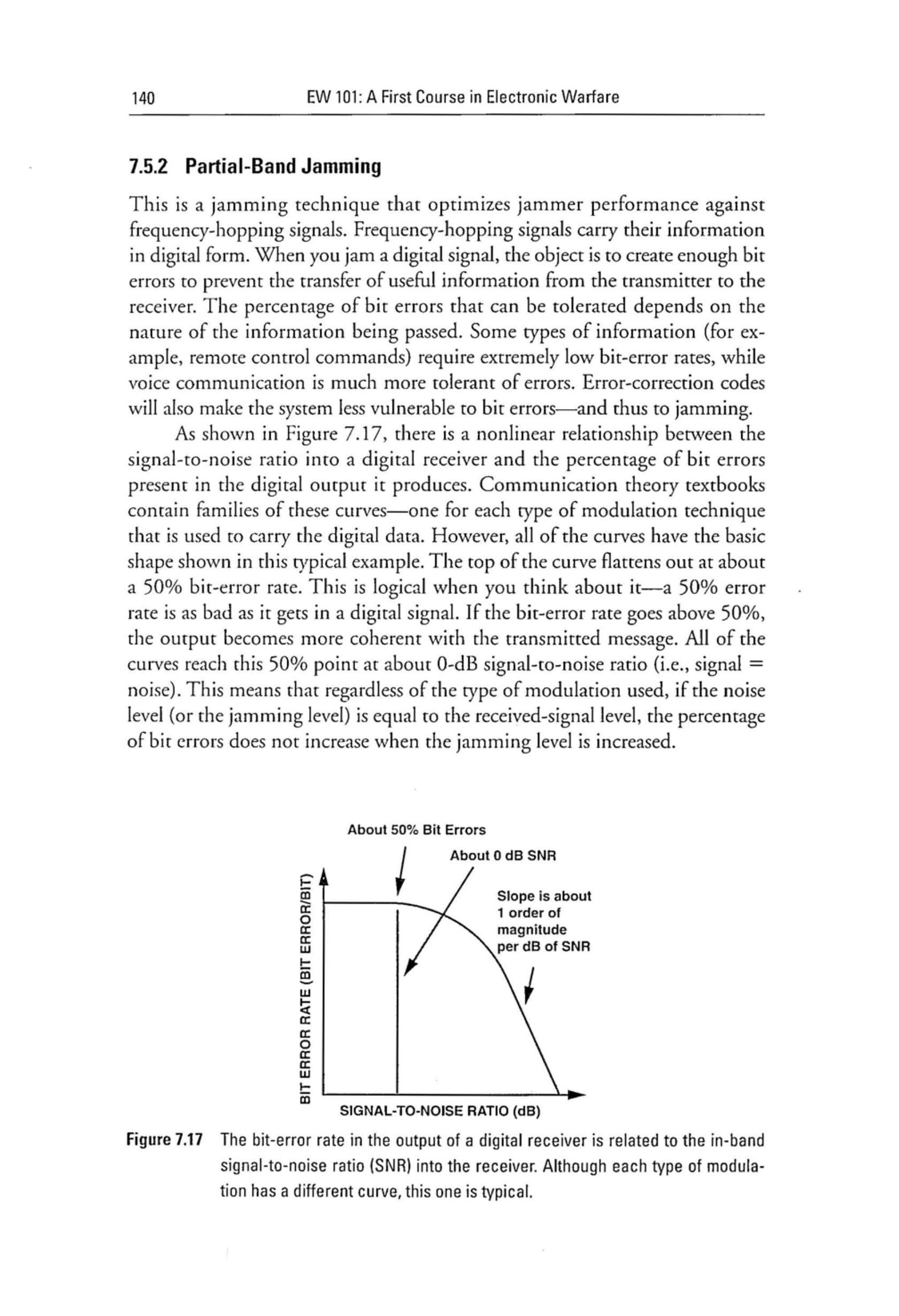 若干扰机功率不足以在整个跳频范围内实现 \(J/S=0 \,\mathrm{dB}\),则需缩小干扰频率范围。通过集中干扰功率于更少的信道,直到每个被干扰信道的 \(J/S\) 达到0 dB,就能通过这种“部分频段干扰”实现干扰效能最大化。如果对发射信号结构了解足够,确信在 \(J/S<0 \,\mathrm{dB}\) 时仍能提供足够的比特错误率,则可采用不同的干扰功率分布以获得最佳效果。