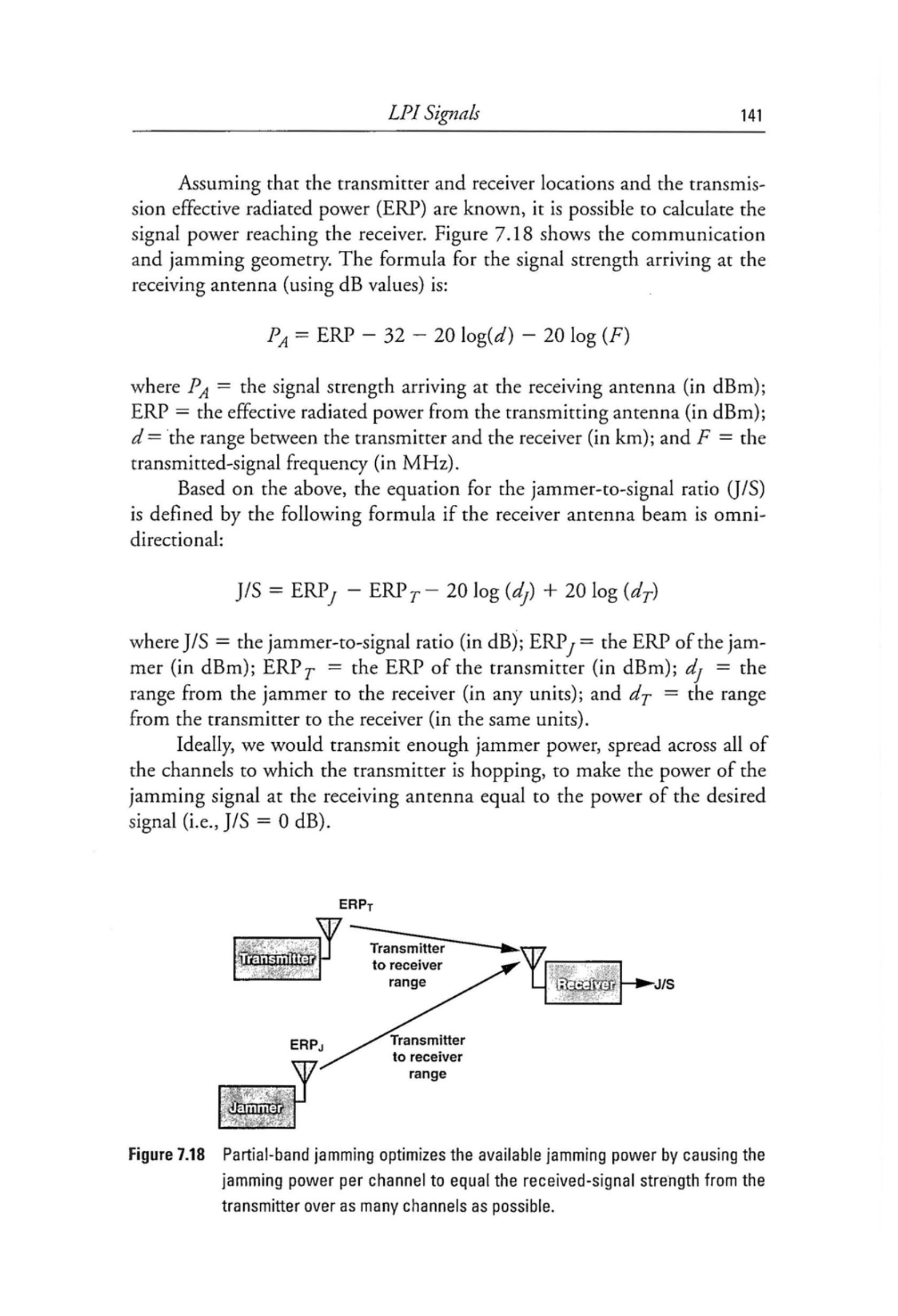 假设发射机与接收机的位置以及发射的有效辐射功率(ERP)已知,就可以计算接收机接收天线的信号功率。图7.18展示了通信与干扰几何关系。接收天线接收信号强度的公式(dB值)为: