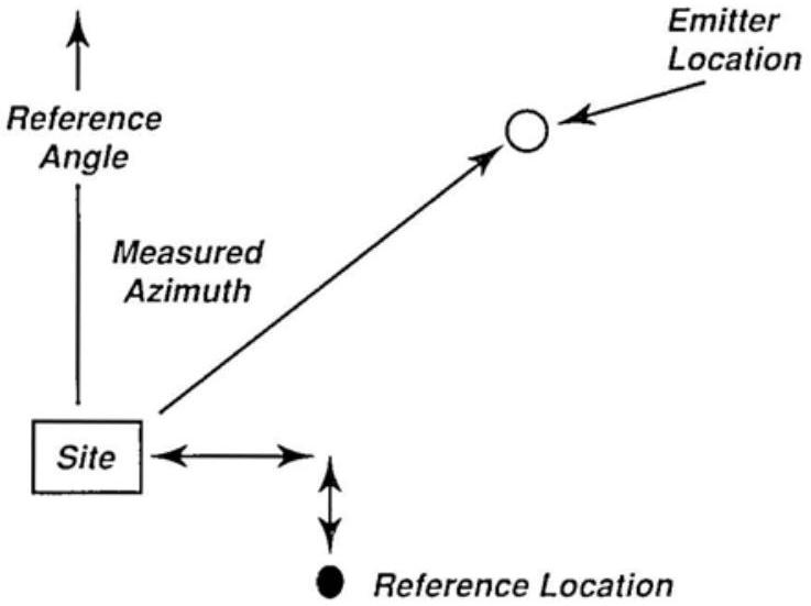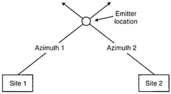 三角测量。三角测量技术通过已知位置的两条线的交点来定位辐射源。图8.1展示了二维情况下的情况,两条线为信号在两个截获点的方位角。当需要在三维空间中定位辐射源时,需要测量每个站点的方位和俯仰。最好有第三个截获点,这样辐射源位置由三条方位线的交点确定。第三条方位线提供了一种“合理性检查”,因为单一方位测量误差可能导致非常大的定位误差。