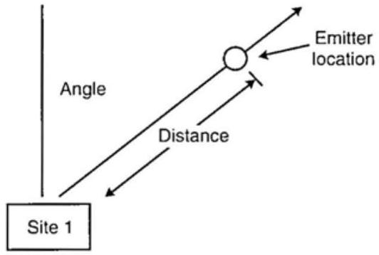 图 8.2 在角度和距离技术中,辐射源到DF系统的距离由接收信号的强度推导得出。