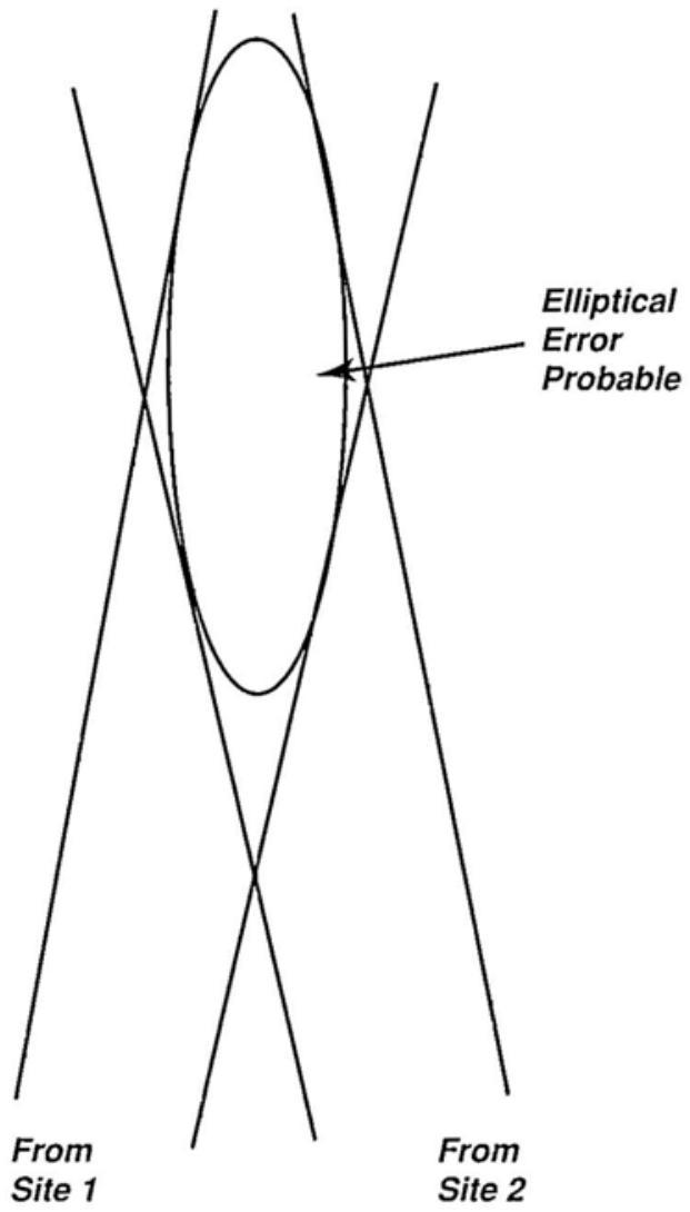 定位精度的另一个问题来源于截获机相对于目标发射机的位置关系。术语圆概率误差(CEP)经常用于描述辐射源定位系统的精度。CEP原为轰炸和火炮领域的术语,指半数炸弹或炮弹落入的假想圆的半径。在辐射源定位中,有时(被误用为)表示一个圆,该圆位于与辐射源相距\(\pm\) RMS误差角的方位线之间,如图8.7所示。定位圆的大小取决于角度误差以及目标发射机与截获站的距离。若要使“CEP圆”确实为圆,两个截获站必须相隔\(90^{\circ}\)(从目标发射机的视角看)并且距离大致相同。当它们相隔小于\(90^{\circ}\)时,如图8.8所示,方位线之间形成不对称区域,需要用椭圆,因此使用“椭圆概率误差”来描述在一个维度上显著差于另一个维度的定位精度。如果站点相隔大于\(90^{\circ}\),或一个站点距离目标显著更近,也会出现这种不对称。CEP一词也应用于这些不理想的几何条件。它通常被定义为误差椭圆的长短轴向量和,并校正为:测得辐射源位置落在真实位置CEP半径范围内的概率为\(50\%\)。
