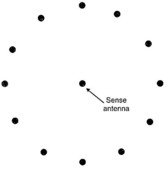 Robert Watson-Watt爵士在20世纪20年代开发的技术被广泛应用于价格适中的陆基机动DF系统。如图8.11所示,三个偶极子天线馈入三个独立接收机,两个端部天线(相距约\(1/4\)波长)的相干和与中央感应天线形成一个心形增益方向图,如图8.12所示。如果将两端天线绕感应天线旋转,旋转的心形方向图即可提供任意方位角信号的入射方向信息。在实际Watson-Watt系统中,天线布置如图8.13所示,外围天线的对置对依次切换到两个接收机中,以模拟旋转。天线数量越多,DF精度越高。但通过合理校准,即使只有四根天线也能提供可接受的结果。