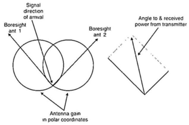 为了理解这种方法如何确定辐射源位置,我们考虑如图8.15所示的两个相距\(90^{\circ}\)的背腔螺旋天线。两根天线的增益模式用极坐标表示。每根天线的输出送入接收机,接收机测量接收功率。从图中可见,天线1接收的功率显著大于天线2,因为入射信号路径更接近天线1的主轴。再看矢量图:两天线接收信号的矢量和指向发射机,其长度与接收功率成正比。如果信号入射方向在两天线主轴之间(且相隔\(90^{\circ}\)),则可由天线1接收功率P1和天线2接收功率P2轻松计算入射方向和接收信号功率: