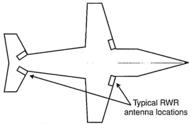 通过如图8.16所示将四根此类天线对称安装在飞机周围,可以实现\(360^{\circ}\)方位覆盖。由于天线的高前后比,对于任何一个发射机,最多只有两根天线会接收到显著功率,除非发射机几乎正对某根天线的主轴。机体的不规则形状会扭曲每根天线的增益模式,从而降低DF精度,除非通过系统校准消除这些误差。然而,要在此类系统中获得高精度的距离或方位测量,需要极其复杂的校准方案——因此,当需要超过\(5\sim10^{\circ}\)的DF精度时,通常采用其他DF技术。