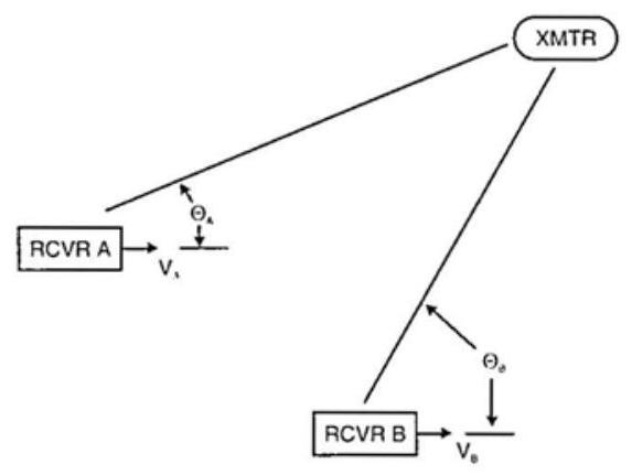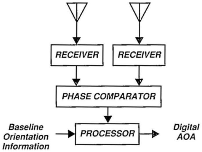 图 8.17 基本干涉仪系统通过比较两副匹配天线馈入的信号相位来确定信号的入射角。