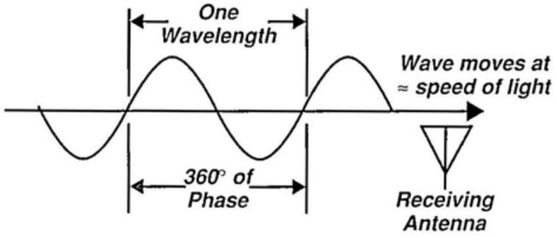 图 8.19 信号以近似光速传播,当一个波长通过接收天线时其相位变化\(360^{\circ}\)。