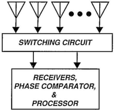 在大多数实际DF系统中,单一基线是不够的;存在歧义,通常需要通过两个或更多方向不同的基线,或不同长度的基线重复测量来解决。因此,完整的系统框图如图8.20所示。完整的天线集称为“天线阵列”,其配置可提供一组最优基线。每次切换到接收机的天线对形成一条基线,按上述方法进行分析。