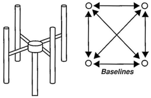 图 8.22 四根垂直偶极子可形成六条基线,用于干涉仪测向系统。