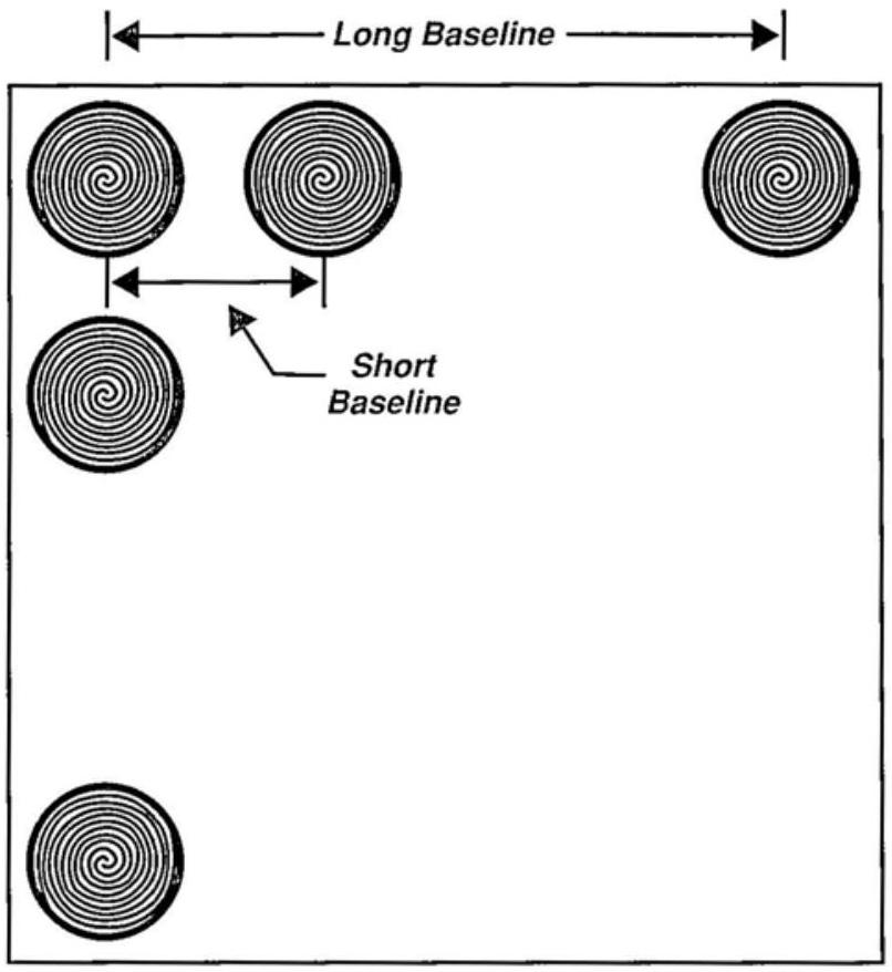 图8.22展示了一组适用于VHF或UHF DF系统的垂直偶极子阵列。在此情况下,任意两根天线均可组成六条基线。对角基线比边基线长1.414倍。