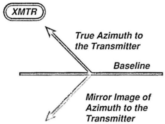 图 8.26 在\(360^{\circ}\)地基干涉仪DF系统中,两条方向不同的基线可以解决镜像歧义。