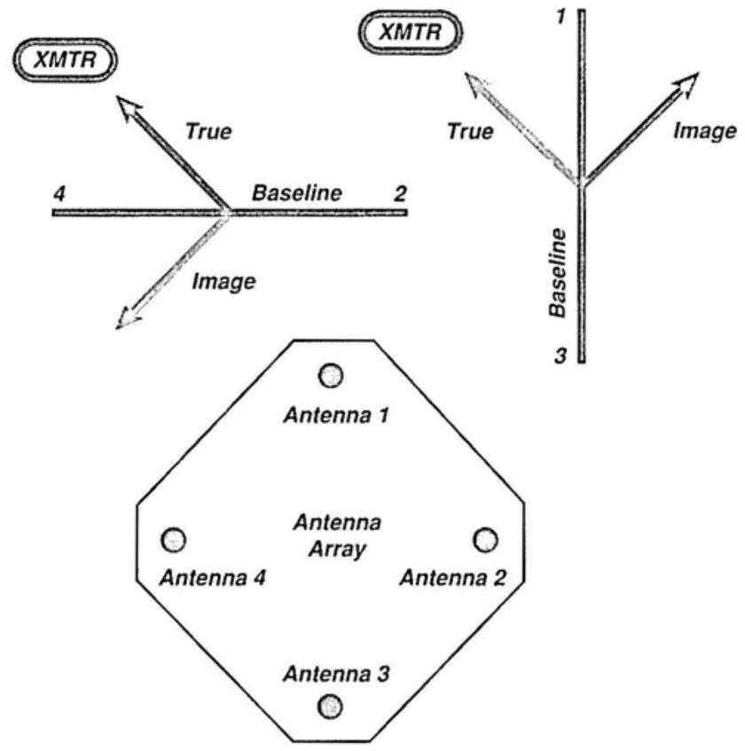 许多地基DF系统必须瞬时覆盖\(360^{\circ}\),其基线天线必须在方位上全向(垂直偶极子最常见)。这些系统通过使用不同方向的另一条基线进行测量来解决镜像歧义。图8.26展示了一个\(360^{\circ}\)地基系统的例子。天线1和3形成的基线与天线2和4形成的基线有一个共同解,该解即为正确结果。