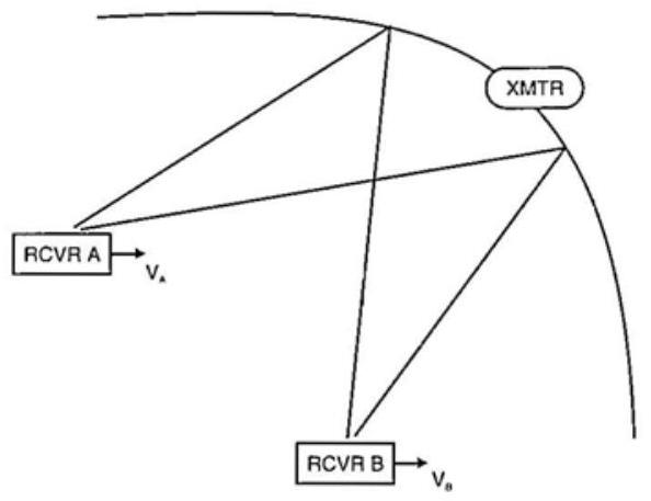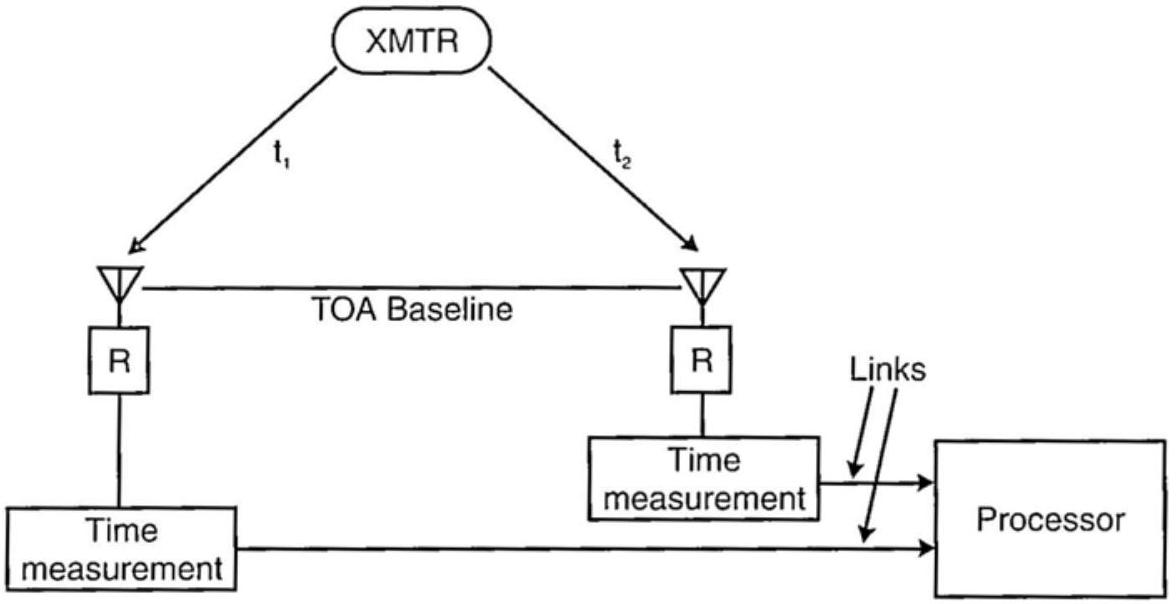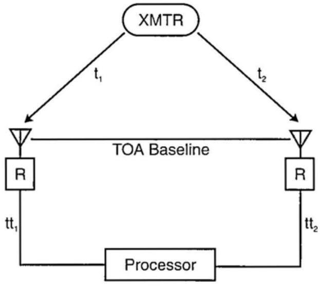 如果两个接收机位于已知位置,且在已知时间发射信号并在每个接收点精确测量到达时间,则可通过计算出的两个距离确定发射机位置。这仅在发射机和接收机位于同一平面时成立(例如发射机和接收机均在视距内且高度接近)。在自由空间中,这两个距离描述一个圆(想象把两根线系在一把钥匙上,两手各握一根线并在垂直平面内摆动它)。如果发射机已知在地表,其位置即为该圆与地表的两个交点之一。当然,如果接收天线有较高的前后比,仅一个交点适用,否则必须通过使用两个或更多TOA基线解决“镜像”歧义。