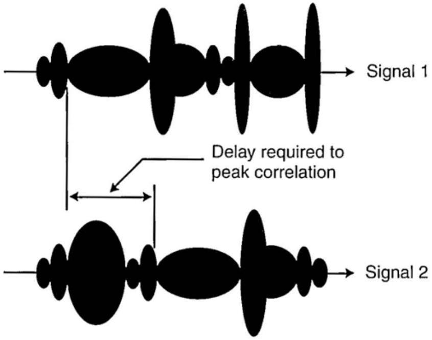 当在快速示波器上观察时,幅度调制信号看起来类似于图8.36中的波形。图中的信号1和信号2是同一信号的短片段,只是由于接收机与发射机的距离不同而在时间上有所偏移。我们可以看到,如果信号1延迟适当的时间,两信号会完全重叠。这意味着它们的“相关性”将非常高。