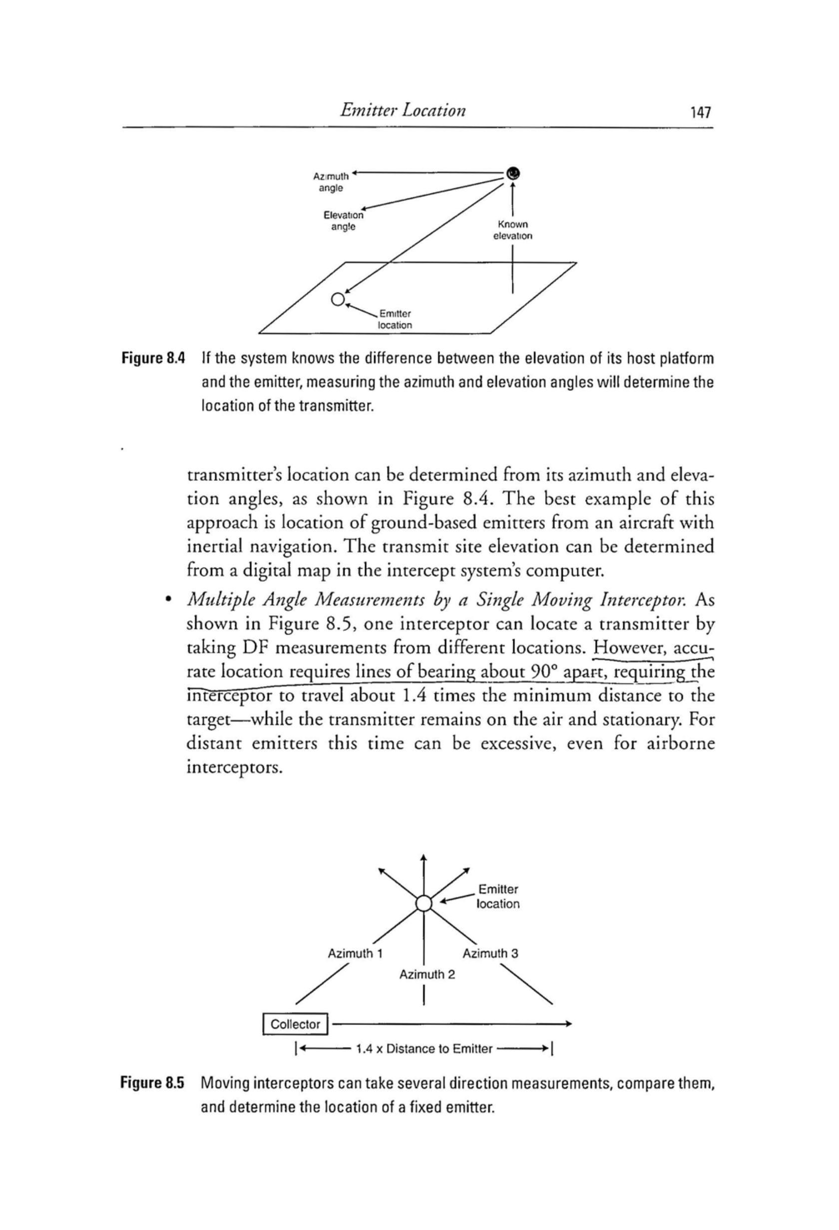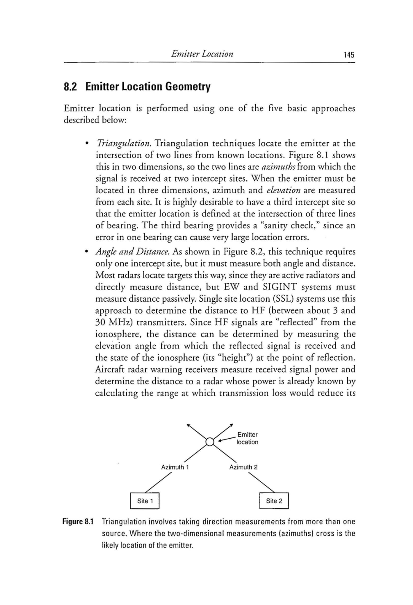 三角测量。三角测量技术通过已知位置的两条线的交点来定位辐射源。图8.1展示了二维情况下的情况,两条线为信号在两个截获点的方位角。当需要在三维空间中定位辐射源时,需要测量每个站点的方位和俯仰。最好有第三个截获点,这样辐射源位置由三条方位线的交点确定。第三条方位线提供了一种“合理性检查”,因为单一方位测量误差可能导致非常大的定位误差。