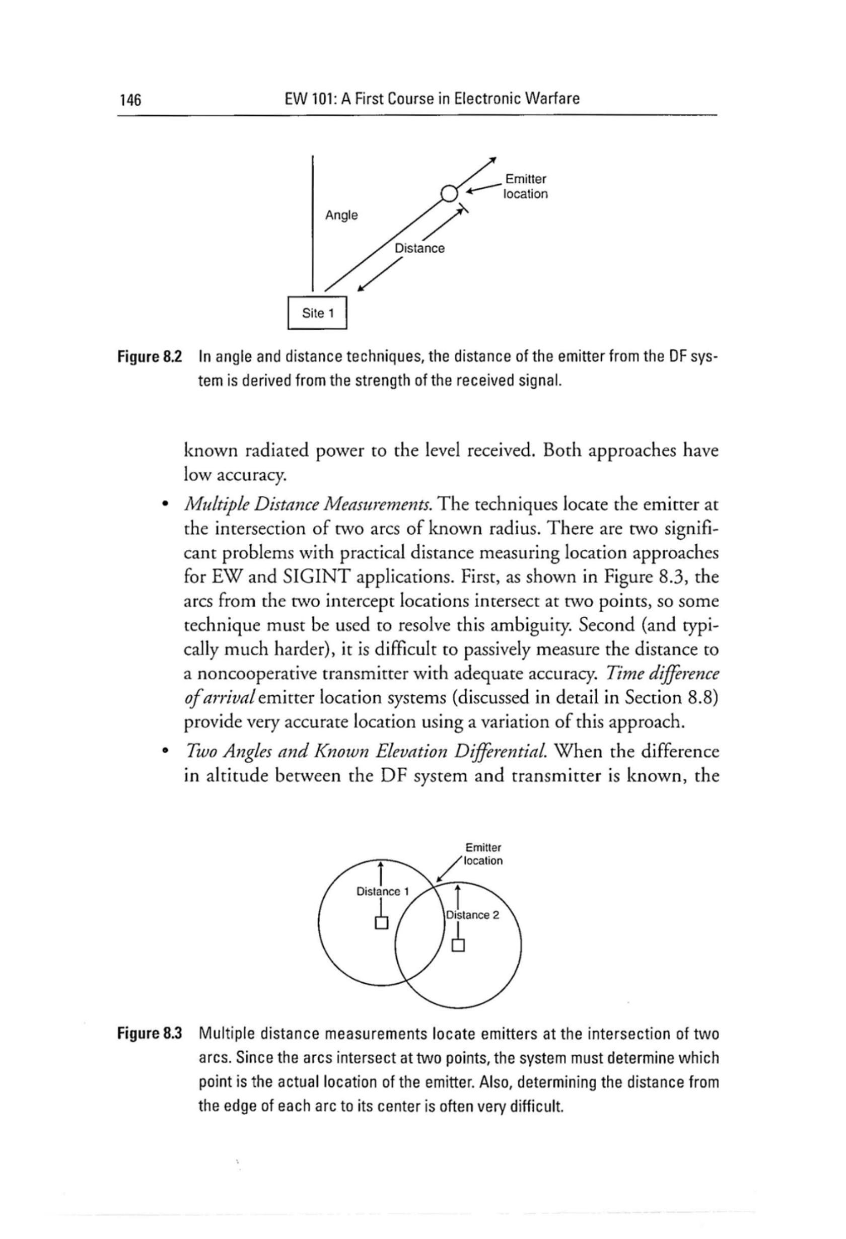 角度和距离。如图8.2所示,该方法仅需一个截获点,但必须同时测量角度和距离。大多数雷达通过这种方式定位目标,因为它们是主动辐射体,能直接测距,而EW和SIGINT系统必须被动测距。单站定位(SSL)系统使用这种方法来测量高频(HF,约3至30 MHz)发射机的距离。由于HF信号从电离层“反射”,可以通过测量接收到的反射信号的仰角以及电离层反射点的状态(“高度”)来确定距离。飞机雷达告警接收机则通过接收信号功率,并结合雷达的已知发射功率,计算传播损耗将信号衰减至接收功率时的距离,从而确定该雷达的距离。这两种方法的精度都很低。