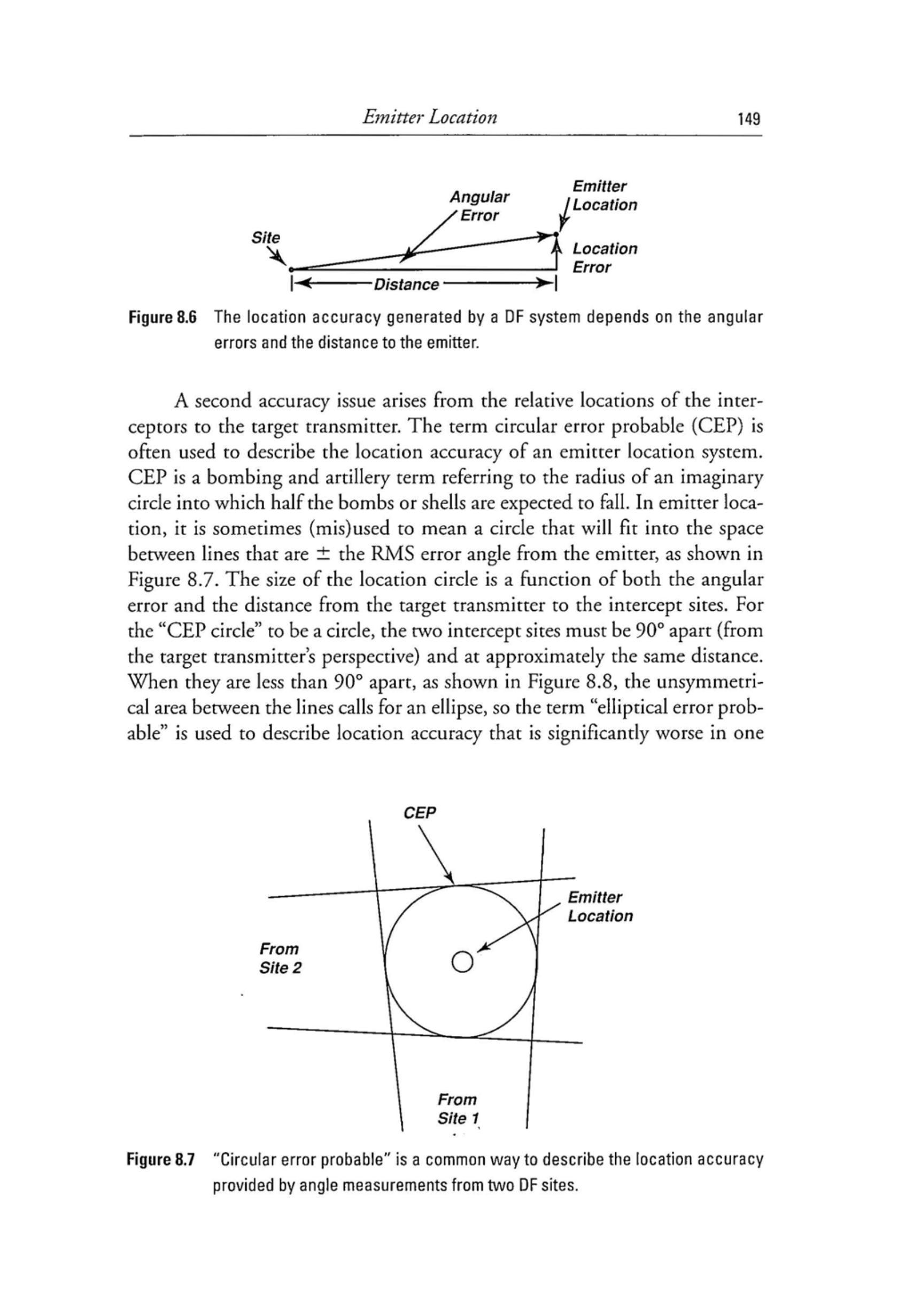 图 8.6 DF系统产生的定位精度取决于角度误差和到辐射源的距离。