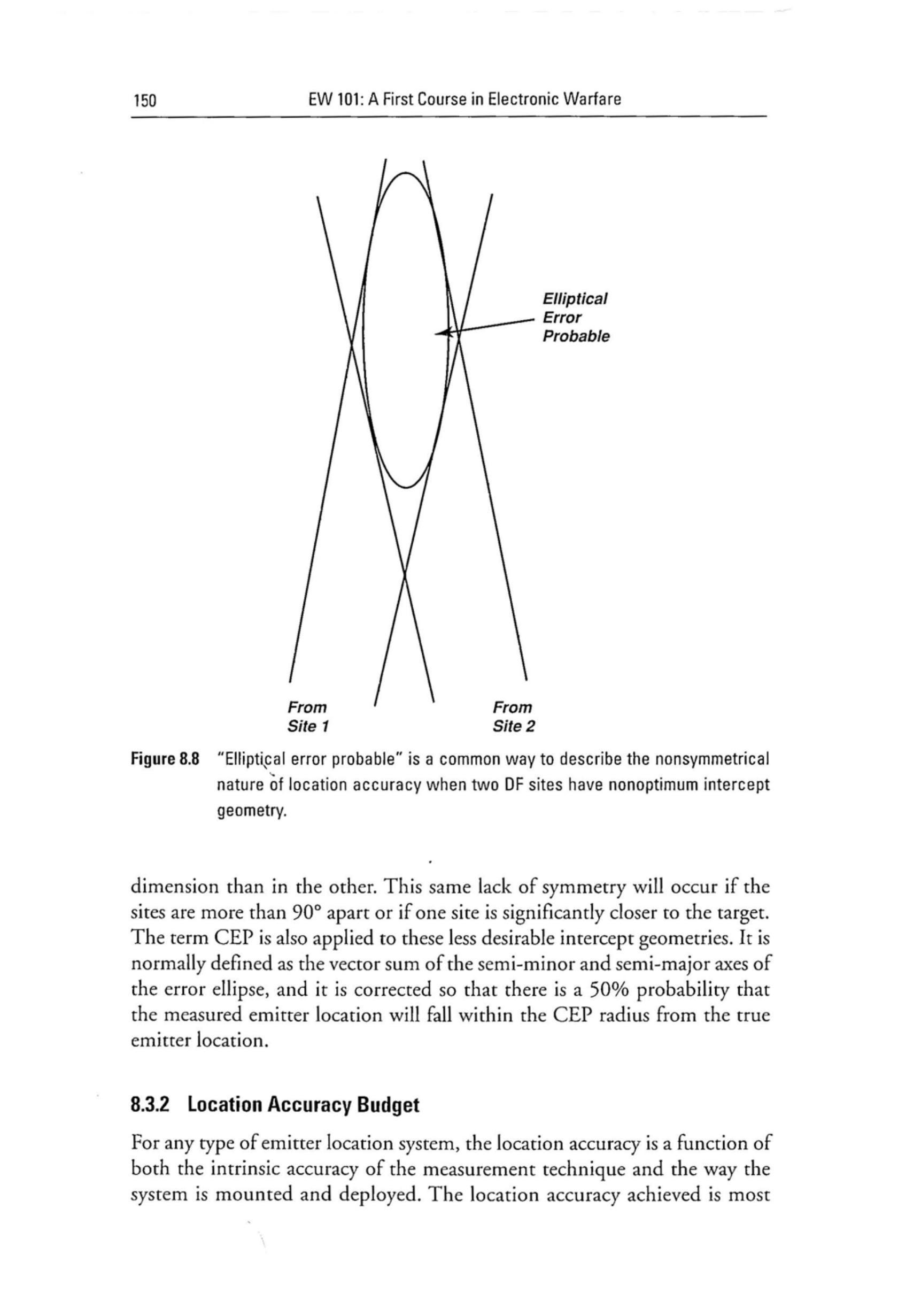 定位精度的另一个问题来源于截获机相对于目标发射机的位置关系。术语圆概率误差(CEP)经常用于描述辐射源定位系统的精度。CEP原为轰炸和火炮领域的术语,指半数炸弹或炮弹落入的假想圆的半径。在辐射源定位中,有时(被误用为)表示一个圆,该圆位于与辐射源相距\(\pm\) RMS误差角的方位线之间,如图8.7所示。定位圆的大小取决于角度误差以及目标发射机与截获站的距离。若要使“CEP圆”确实为圆,两个截获站必须相隔\(90^{\circ}\)(从目标发射机的视角看)并且距离大致相同。当它们相隔小于\(90^{\circ}\)时,如图8.8所示,方位线之间形成不对称区域,需要用椭圆,因此使用“椭圆概率误差”来描述在一个维度上显著差于另一个维度的定位精度。如果站点相隔大于\(90^{\circ}\),或一个站点距离目标显著更近,也会出现这种不对称。CEP一词也应用于这些不理想的几何条件。它通常被定义为误差椭圆的长短轴向量和,并校正为:测得辐射源位置落在真实位置CEP半径范围内的概率为\(50\%\)。